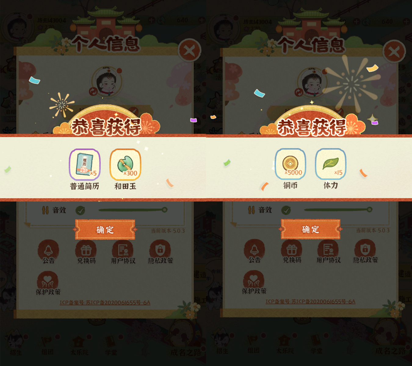 ★ 福利·第一弹:铜币*5000、音律升级材料*10、猫猫团子*1、柴柴团子*1、普通简历*2、和田玉*300