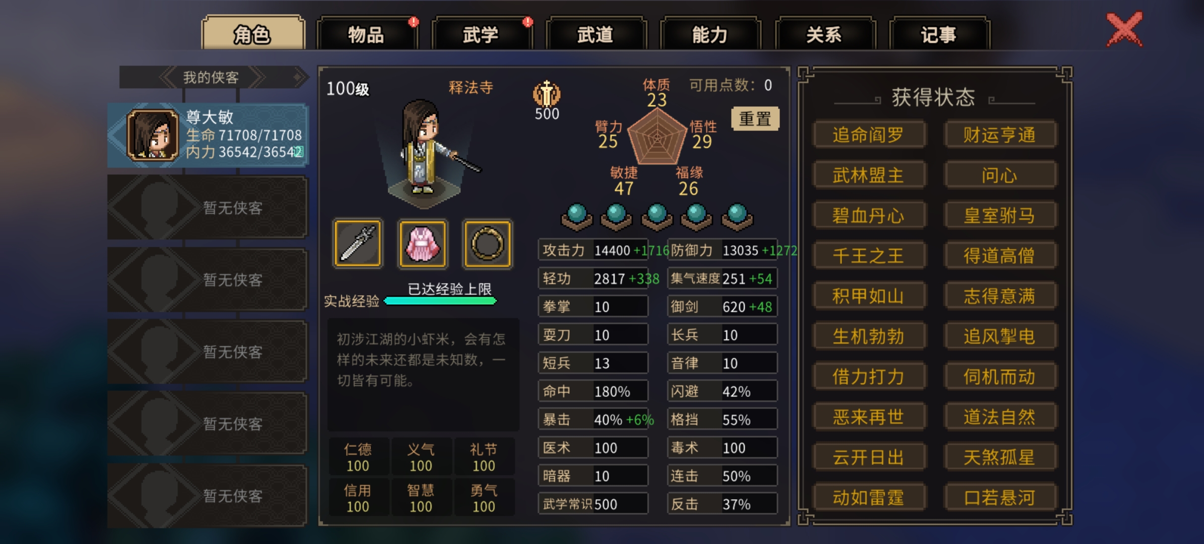 一.天赋放弃气血+心宽,其他都大差不差(乙级剑内功+乙级剑外功+两本甲级内功+功德牌+金丹)