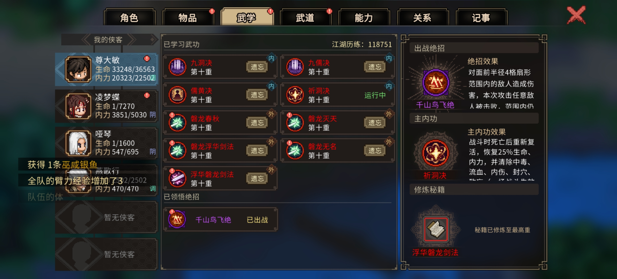 5.2功法——天魔噬魂(这东西有点费劲,好像说开海椒帮mod可以直接买,我没开过这个)+九州决无极洞 ——祈镶无极洞(50级吸蔡蔡的关键)+广陵曲/万民掌/磐龙剑法/其他——根据流派选两个