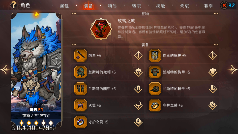 恐怖飞锤人——霜骑,酒杯圣物提供大约40命中和控穿,特质把最后一个洗成健步如飞然后再带灭世项链就可以稳定抢一速控怪(治疗书拿一个对自己释放然后奶队友就可以回6能扔锤子了)使得这套阵容可以无压力打全boss。装备上命中堆满,防具选择上词条所有抗性+下词条任意两条属性抗性(例如劈砍抗性+穿刺抗性)最大化酒杯圣物的收益