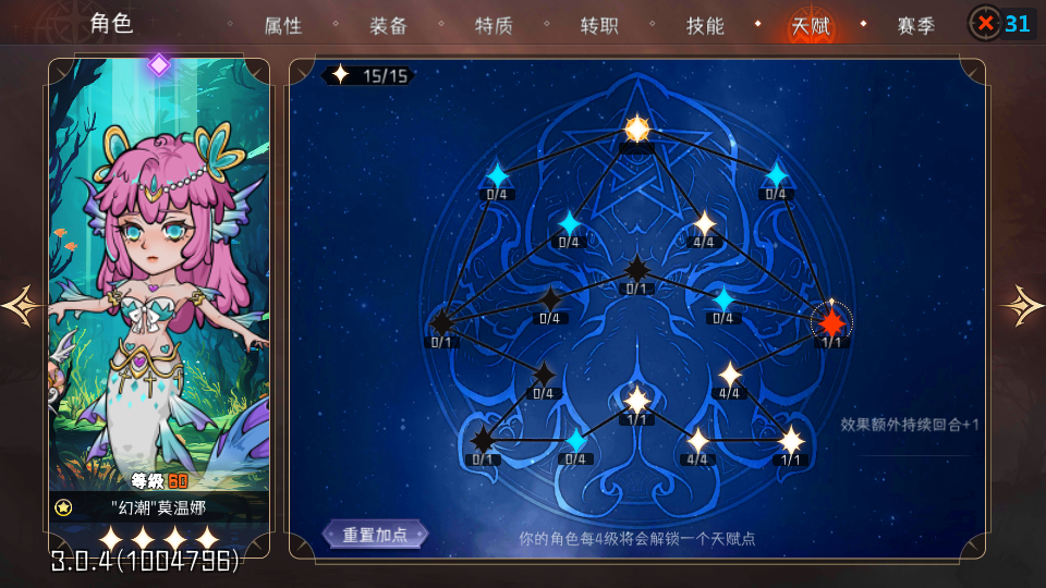 天神方面最优先魔法神点出冷却时间-1,这样鱼牧的纯净疗愈就能一回合一次了,剩下两个天神建议暗黑(神中神,点回能、移动力和攻击力)和护卫(增加容错)