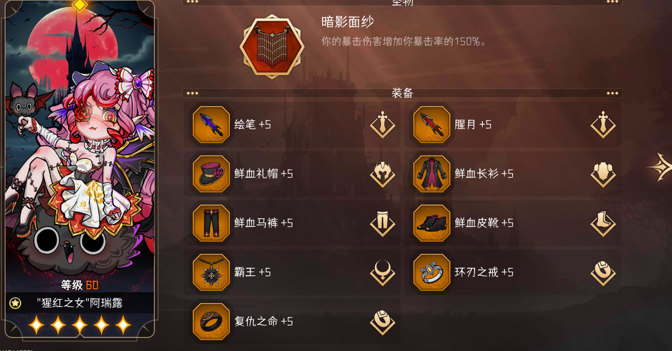 (1)面纱圣物,鲜血套,这套输出属性要求命中和暴击还有所有伤害,暴击伤害靠面纱去转换,适用于比较高命,基础属性够高的玩家,但打无头哥直接白给。