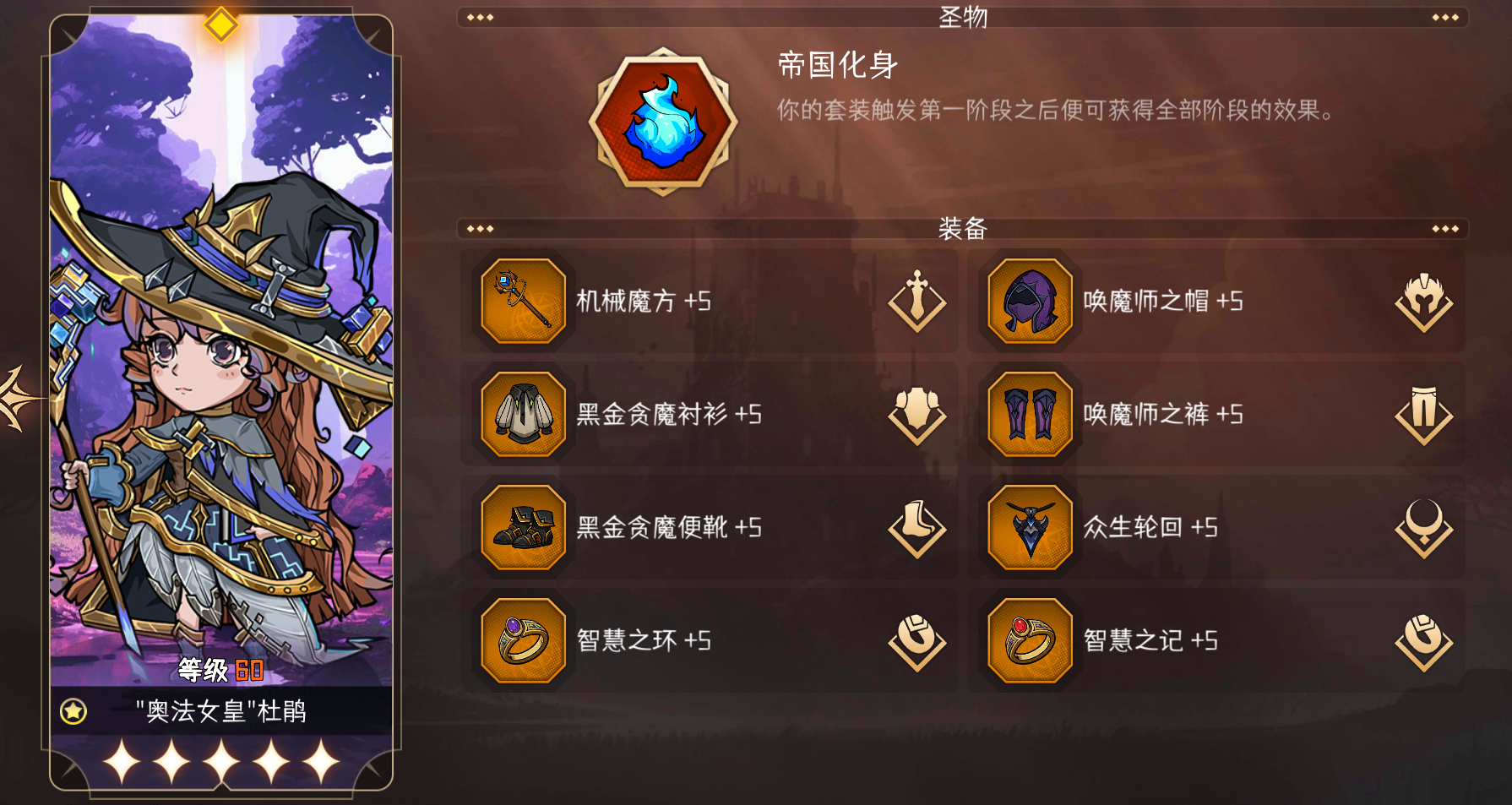 装备方面我个人目前在用的是这一套,虽然指挥官套在更新之后新增了破盾很香,但效果终究还是不算适配该体系下的杜鹃,再有一个就是该体系下其他圣物对杜鹃的提升都有限,所以经过一些简单的测试之后我选择了黑金+唤魔的2+2。