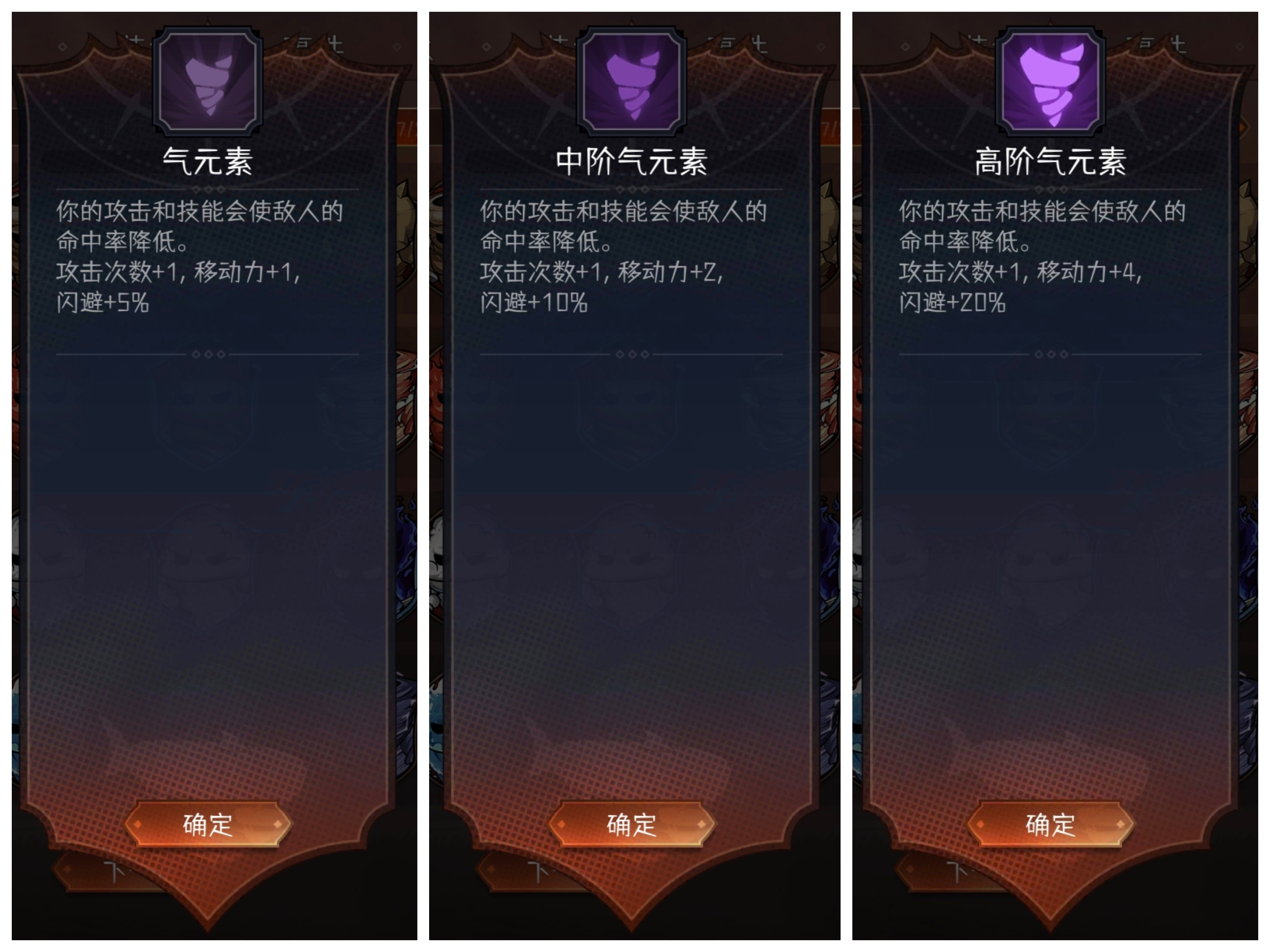 气元素:增加攻击次数和减敌方命中,单个看不如其他2个,但是气元素可以有3个3合1可称神。