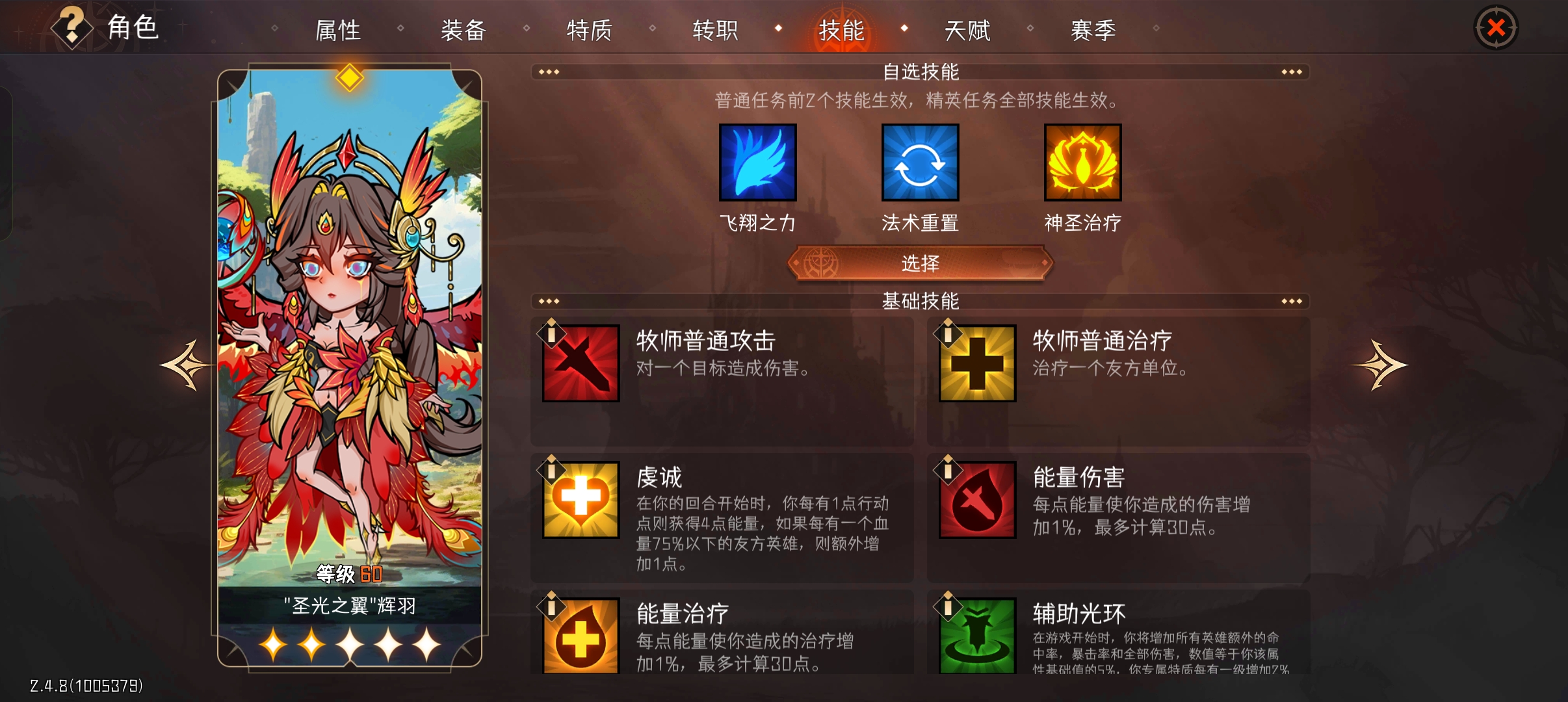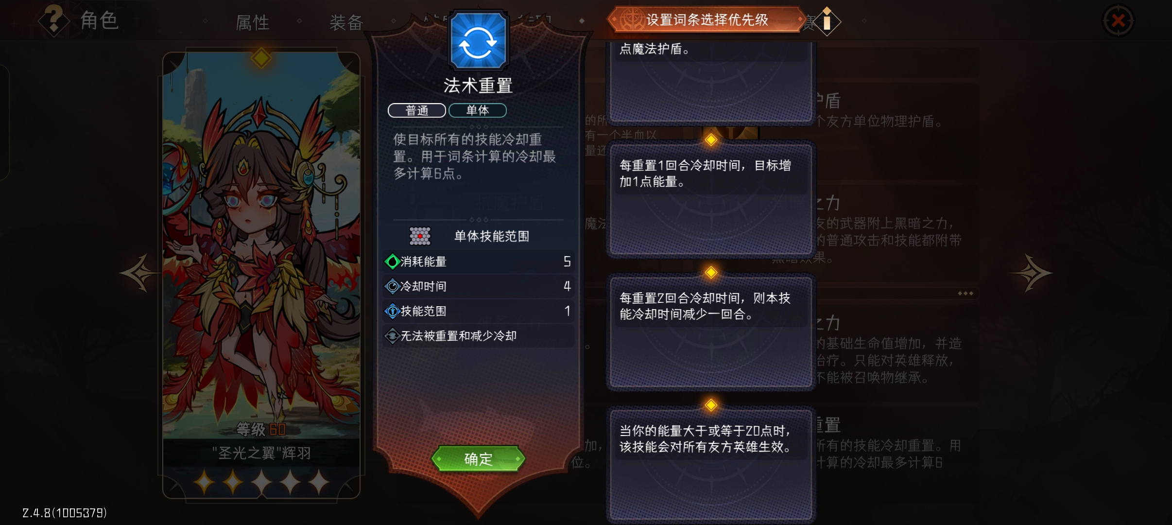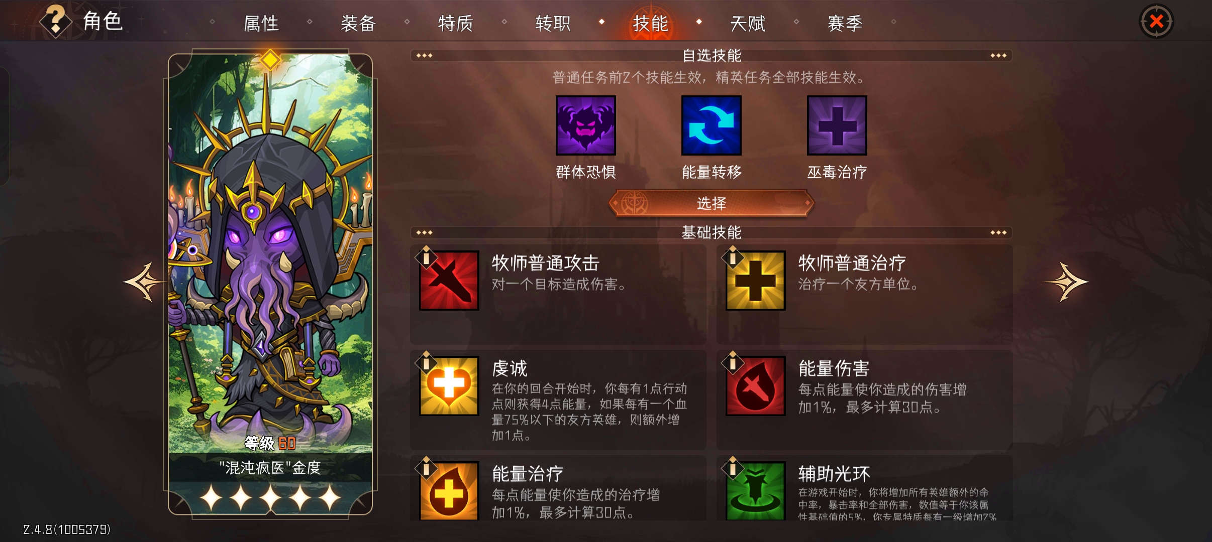 技能选择:因为是 dot 流,我们不用刷新帝牧和两只丛林牧师的技能,丛林牧师优先选择技能词条净化负面效果,增加护盾,自己消耗能量减半,不要选择给群体转移能量。dot 流对鸟牧的词条非常关注:如果到最后三关时,你的技能重置未获得20能量对全体生效和每重置两回合减1冷却这两个金词条,就需要用金币刷新出这两个词条。