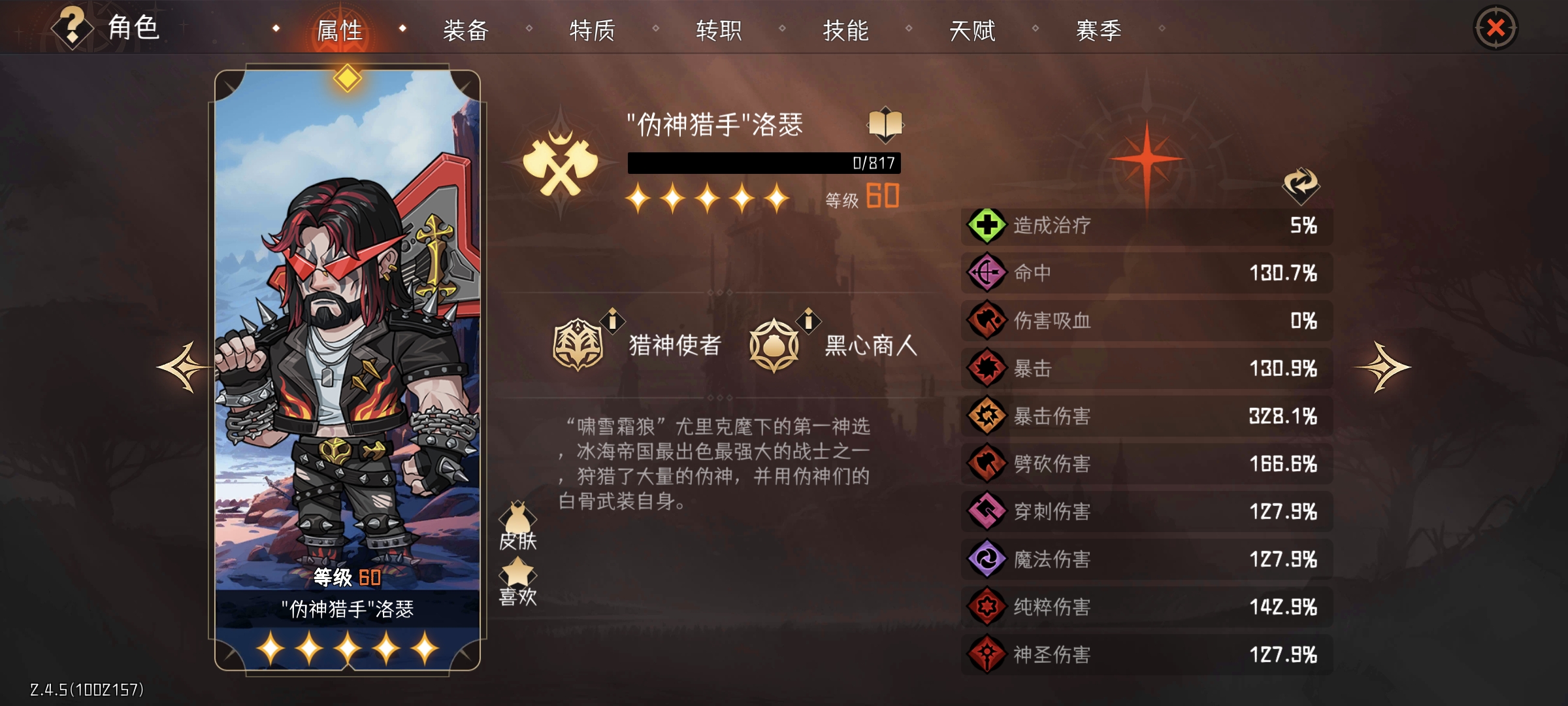 虽然少了一些赛季词条和装备效果,少了32%的命中暴击、20的攻击防御治疗、65X造成伤害、15X受到伤害、坤坤上挑斩降低防御和闪避、鳄鱼的赛季词条降低15劈砍抗性,但多了光牧帝刺双光环的双光环,有控制有净化,感觉还行。