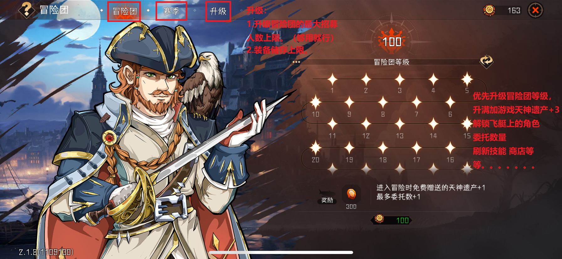 优先升级冒险团等级,升满加游戏天神遗产加3个。解锁飞艇上的角色,增加委托数量,可以刷新技能商店等。