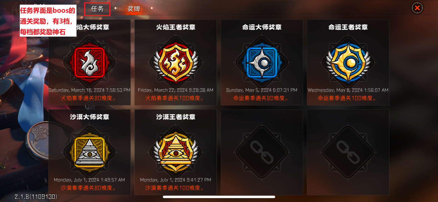 任务中有boos的话通关奖励,有3档,每档有神石奖励。