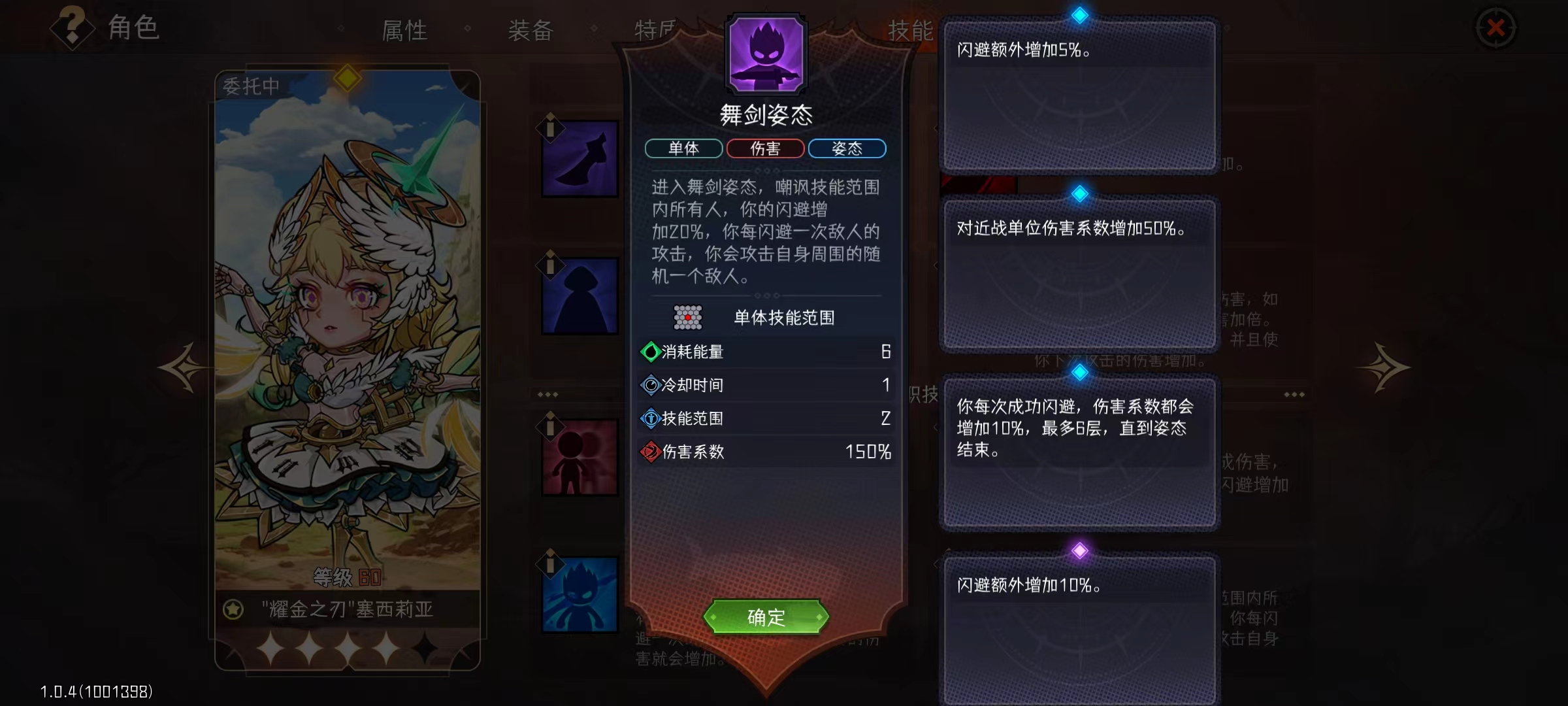 舞剑姿态提供20%闪避,词条蓝紫金词条取平均值15%闪避,算上专武的35%技能强度加成则总共提供:35%X1.35≈47% 。