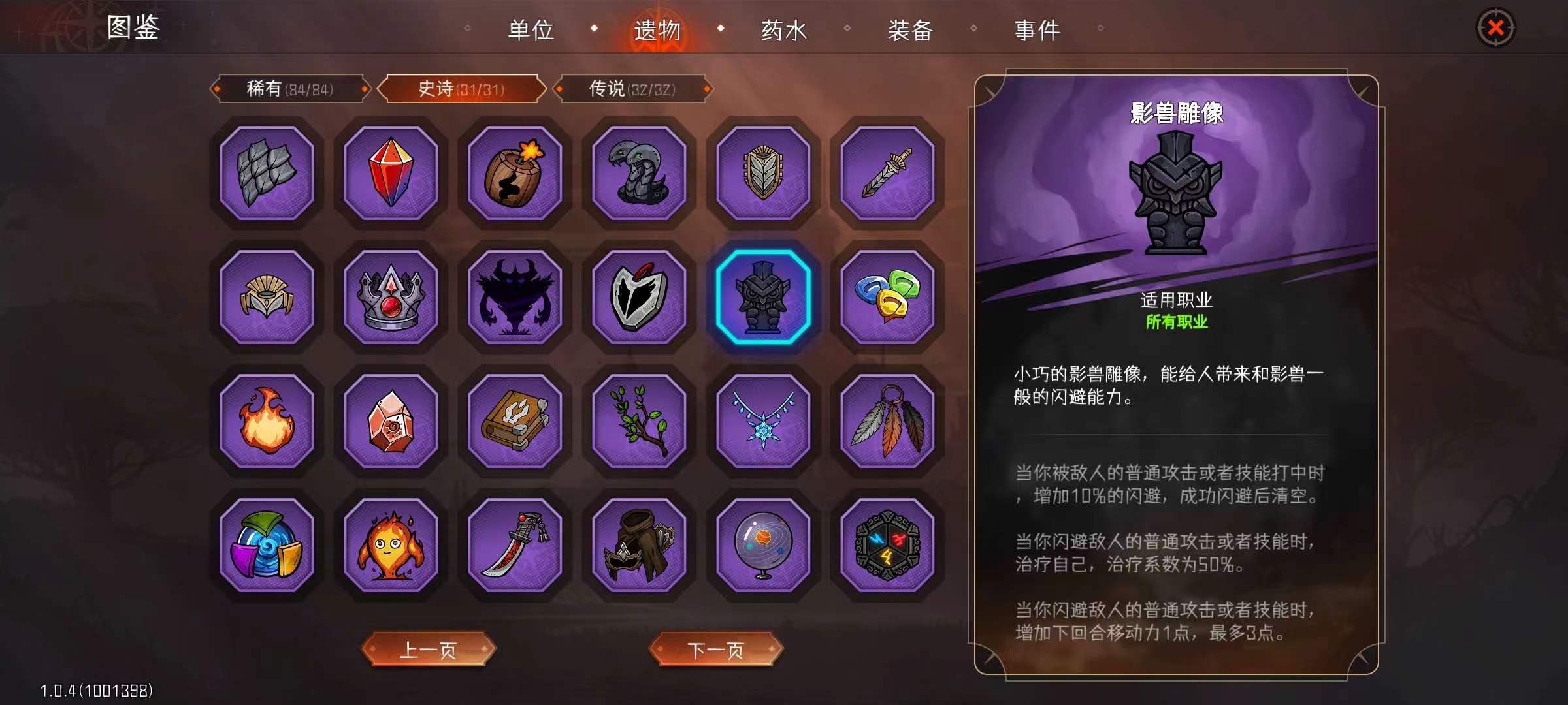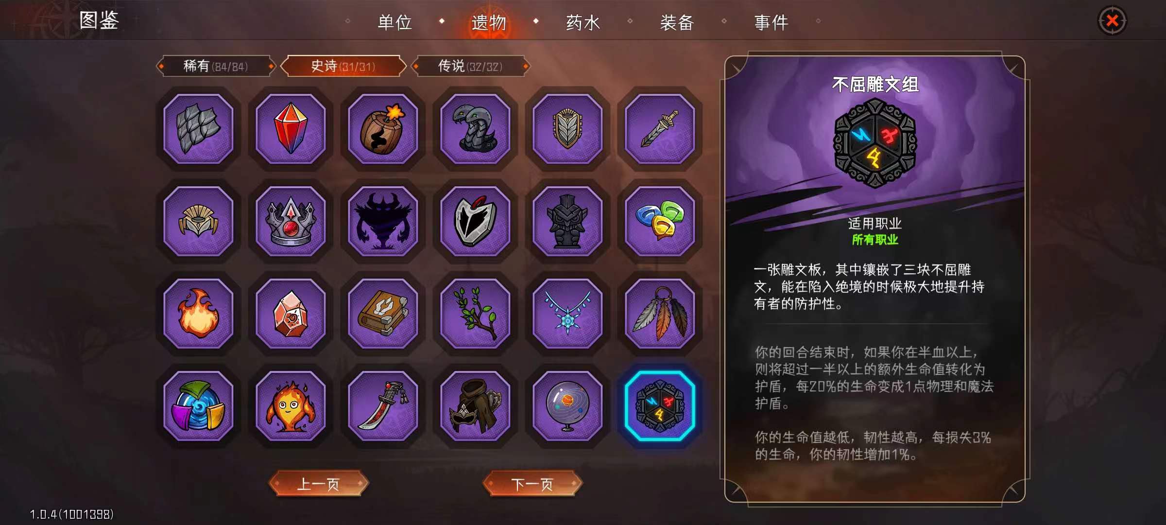 紫色遗物不屈雕文组可以通过压血线的方式极限获得33%闪避,但鉴于游戏内无法100%闪避,保险起见取33%的血线以换取22%的闪避。