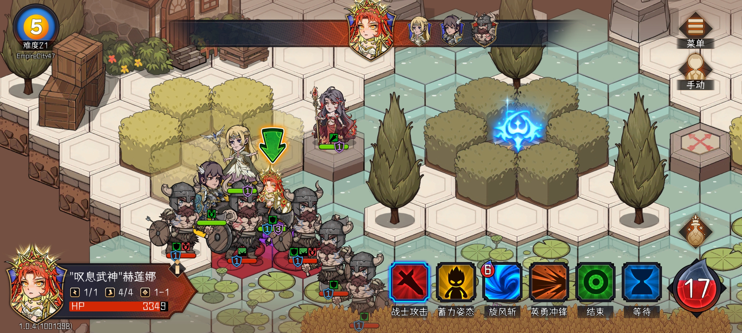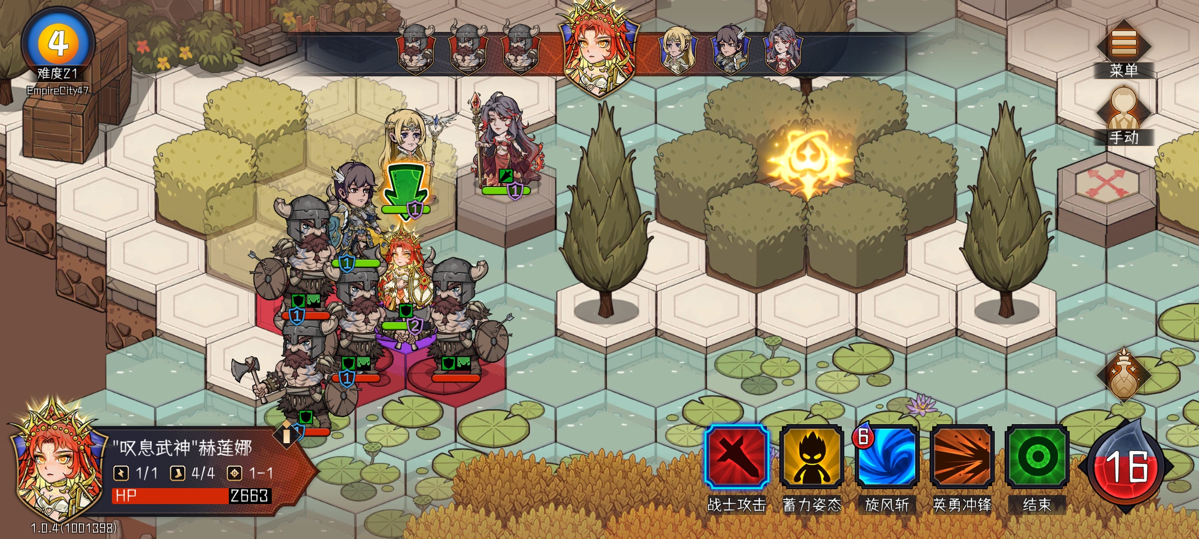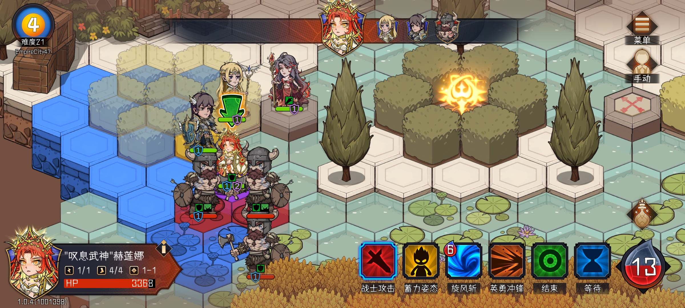 此时针对敌方残血单位进行集火,避免轮到该单位回合时触发回血。至此通过“等待”的机制,调整角色行动顺序,将我方单位两回合的输出伤害在敌方单位回血前全部输出完成。