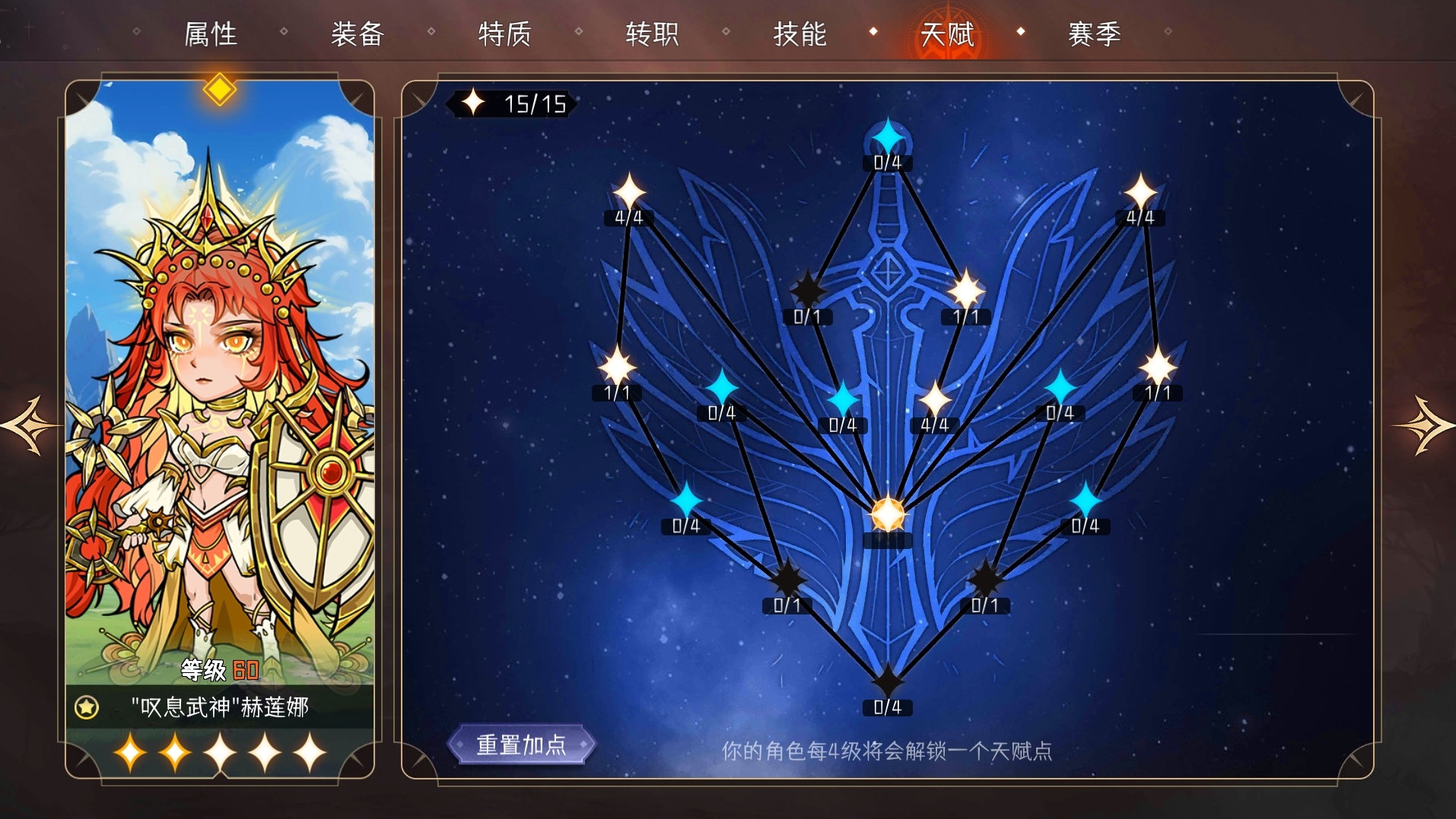 按需点,4级解锁一点,最高60级15点。可以无限重置免费加点。