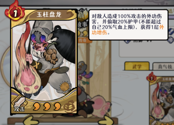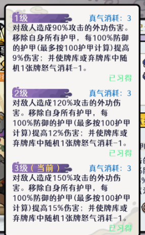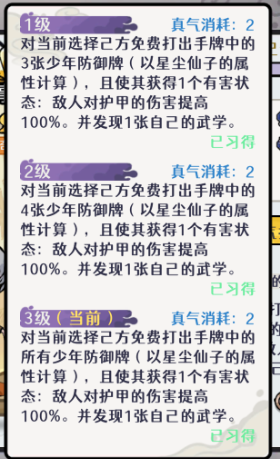 打出星辰武学让帮主护甲翻倍,并且使用该卡会给星辰回一点真气,配合发现的一张星辰武侠卡回一点,共回两点真气。重复释放星辰武学,叠甲然后发现一张星辰武侠卡
