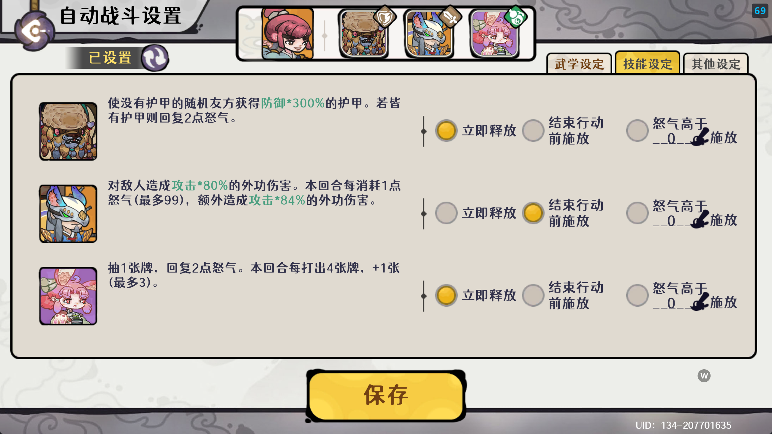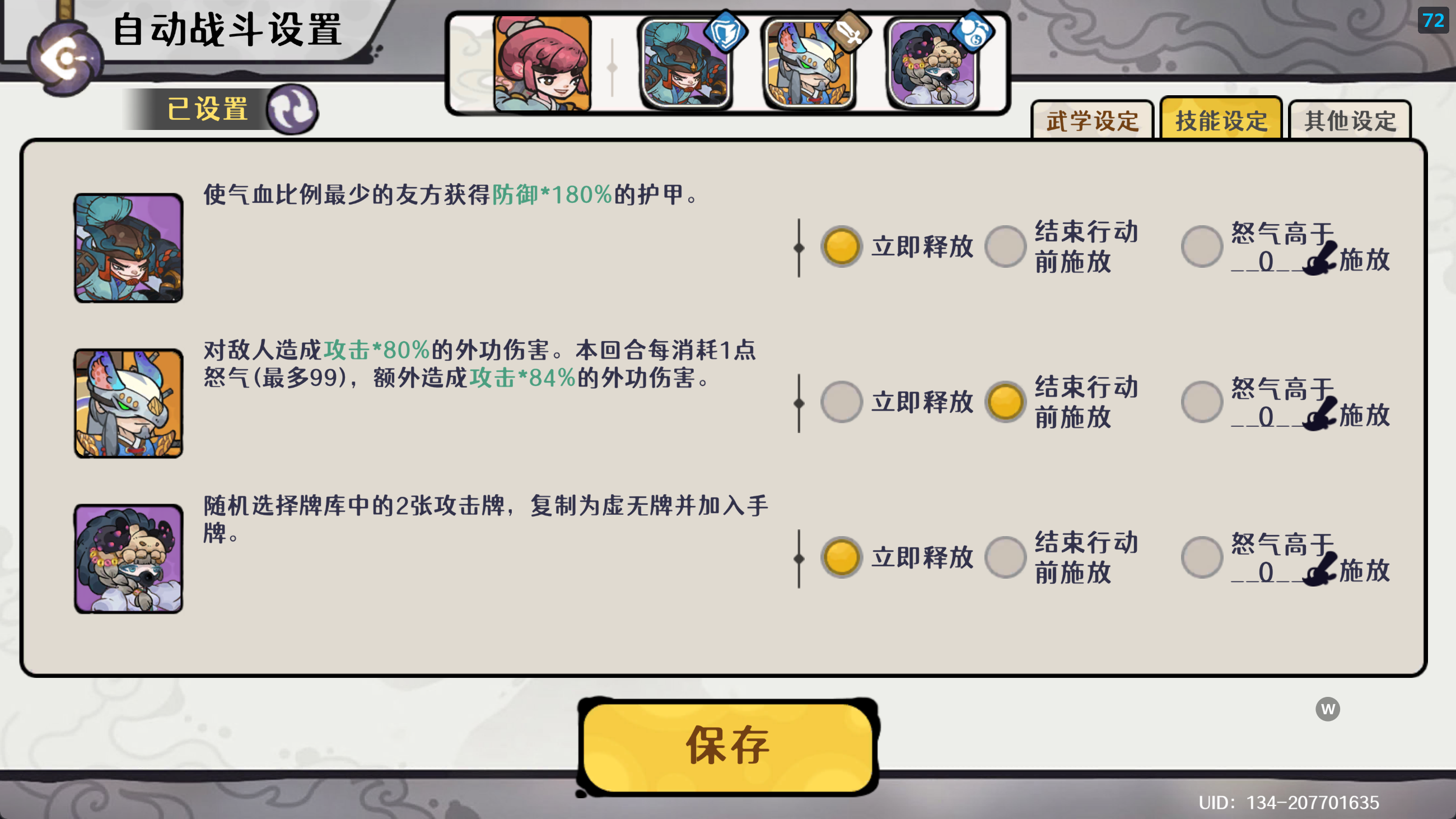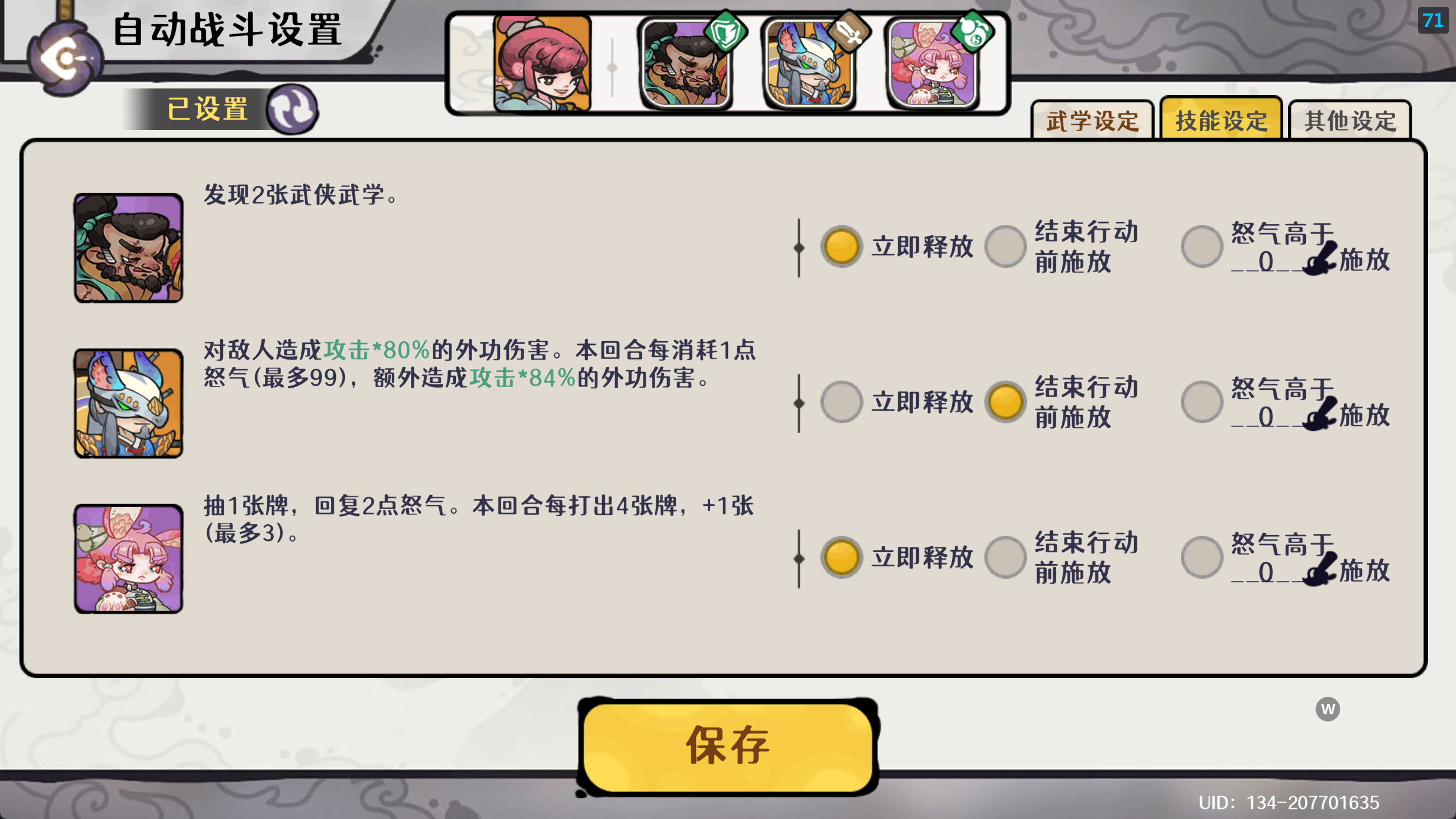 开荒第二天整个的核心围绕着 几张关键武学的获取及升级,在自动剑魔这套体系中 输出伤害倍率的一张卡名为:【弹指一刹】升满级的伤害高达700%! 尽早获取这张卡对于我们输出端的提升是非常大的。