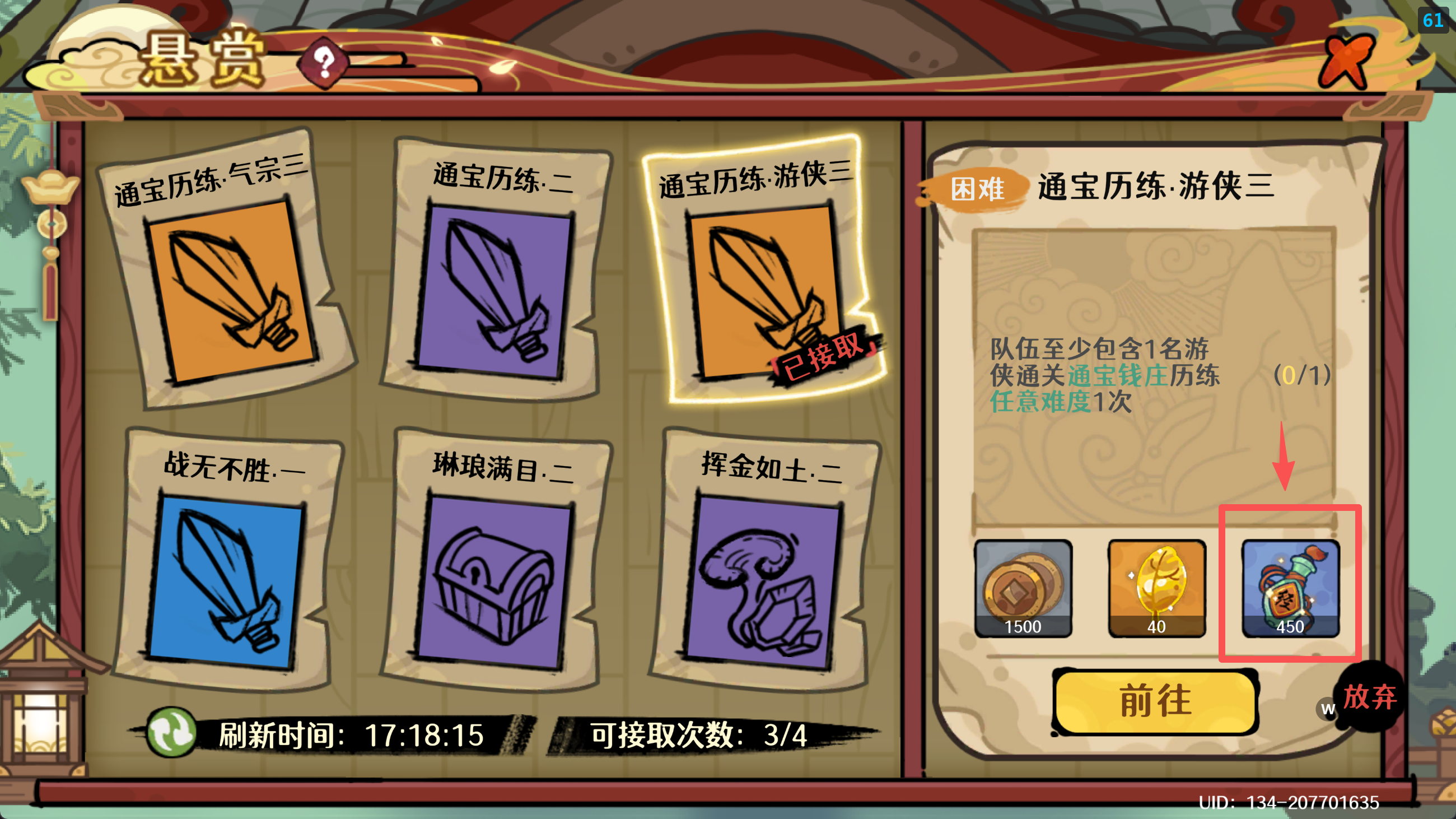 当我们第二天推完主线【云溪竹径 异族地道】之后,账号等级会达到15级,解锁了古今2每日悬赏任务。后续每天登陆游戏的核心内容就是完成日常4个悬赏任务,通过完成任务我们可以积累大量的经验值、金叶。
