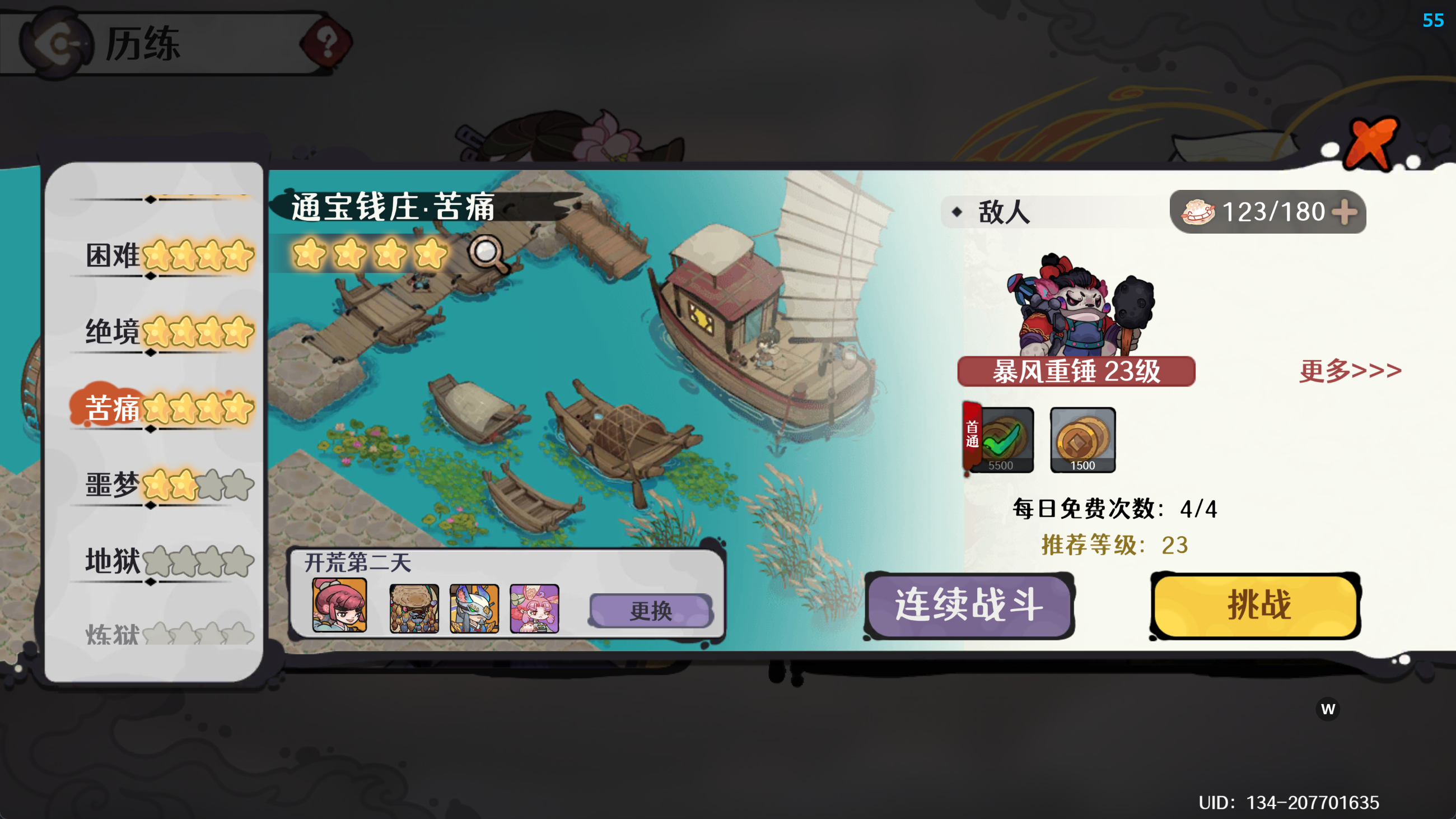 第二天依然没有特别的体力规划,我只买第一次50金叶的体力。注意账号体力上限会随着等级的提升而增加,每升一级增加5点体力上限。前期我们的体力上限比较低比较容易溢出,建议及时清体力。最省事儿的办法就是【通宝钱庄】【天录书局】一键扫荡当前最高难度,轻轻松松获取前期关键道具。