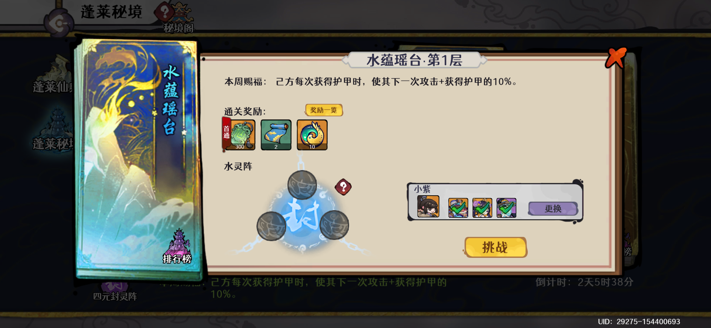 奖励讲解:玩法奖励分为一次性首通奖励,和周刷新奖励,首通奖励即为蓬莱材料(升级少年卡材料),终于不缺蓬莱材料了