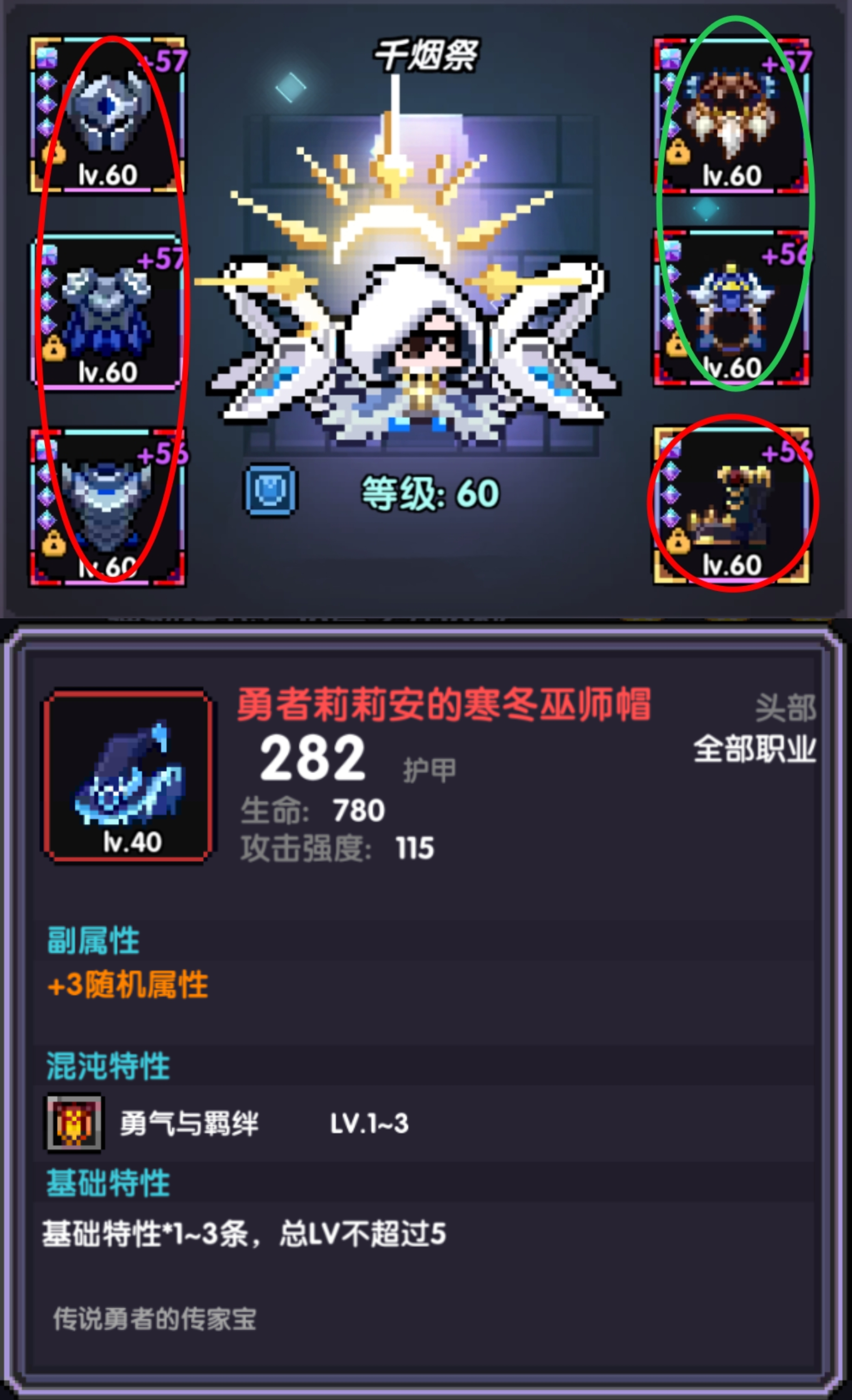 ②由于每件装备可以重铸一个词条,因此,挑选红圈中的装备应该需要具备1条金色输出词条,然后洗另外1条金色输出词条。绿圈中的装备五条输出词条分别是暴击值、爆伤、攻强、元素攻、护穿,因此挑选绿圈中的装备时应该具备这5条中的2条金色词条,然后洗出第3条金色输出词条。前期优先考虑暴击值和护穿;后续元素攻和爆伤通用,护穿主要打大秘境,攻强主要打世界、竞技场,暴击则可作为任意场景暴击率不够时的补充。