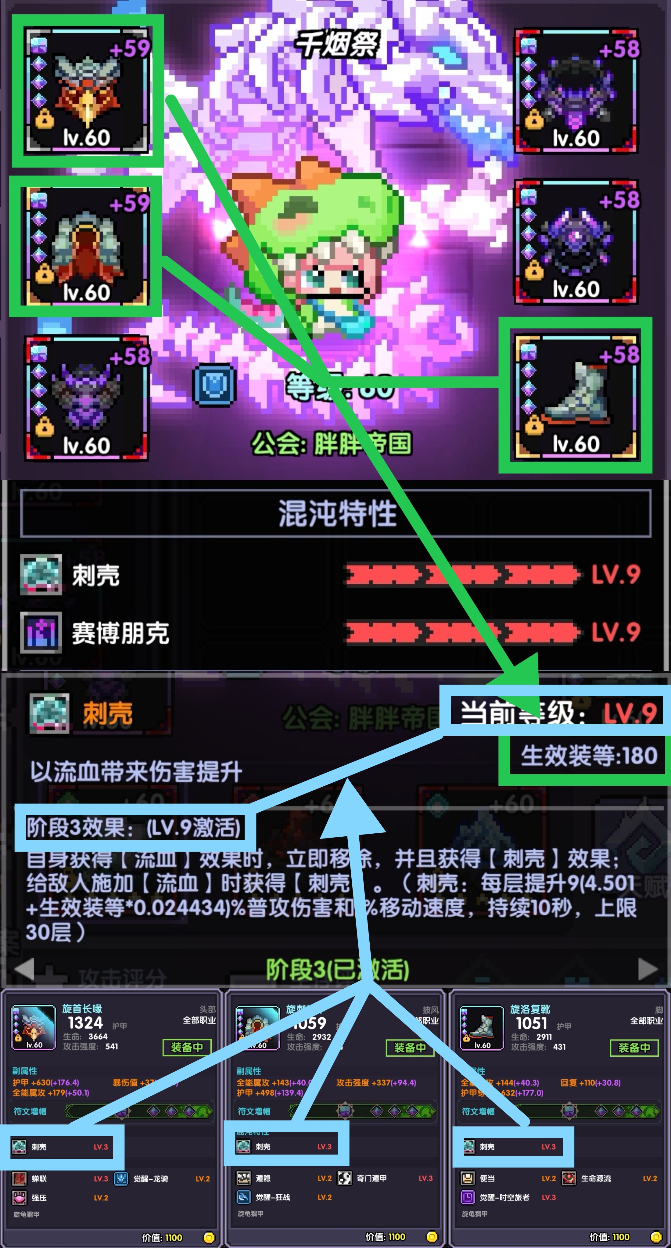 上图中,可以看到穿了三件60级刺壳,因此生效装等就是180。