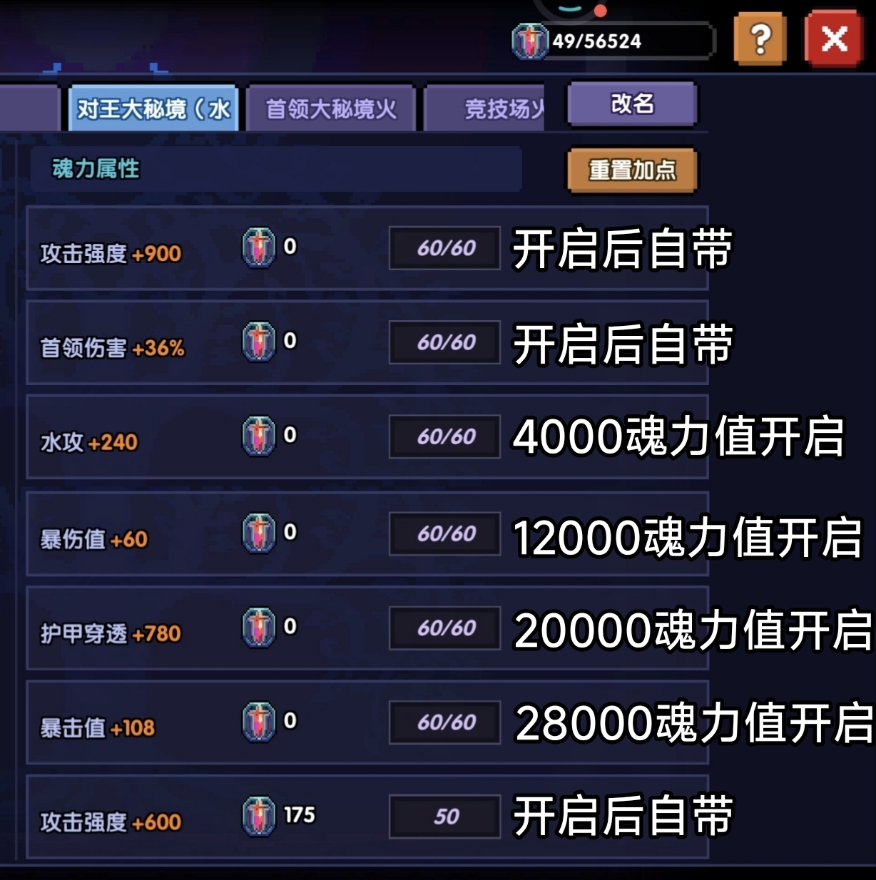 一般来说,暴击值属性我们选择在武器、防具首饰上洗的性价比会更高,魂力上的暴击值只是作为后补补缺。而其他属性则根据各个场景来做调整,因为魂力加点一旦点好就不能再修改了,只能花100钻石购买“灵魂之种”重置或者重开新的一页,所以这里我们就要分开每一页对应一个场景来加点,这样我们就不用重复每次都花费100钻石来重置了。