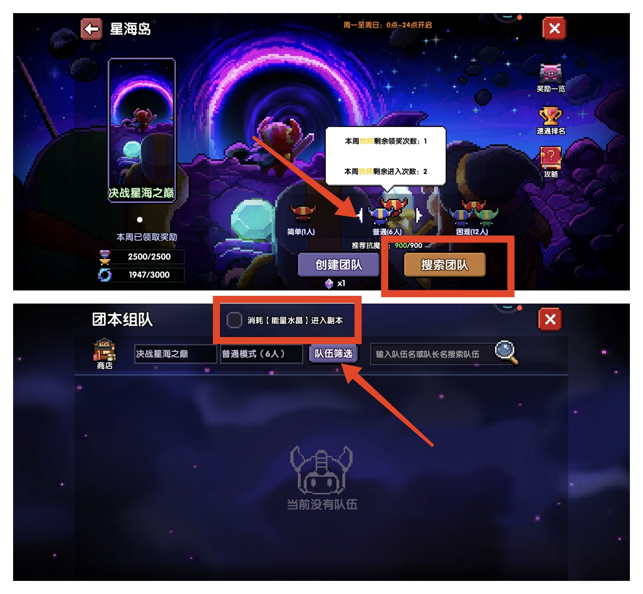 3.2单人通关一遍简单的樱花岛和星海岛之后,解锁普通模式,这时我们要做的是继续打普通模式,值得注意的是,我们不要自己创建团队,而是要搜索团队,因为自己创建团队是100%要消耗水晶的,而搜索团队我们是可以选择不消耗水晶去通关的。