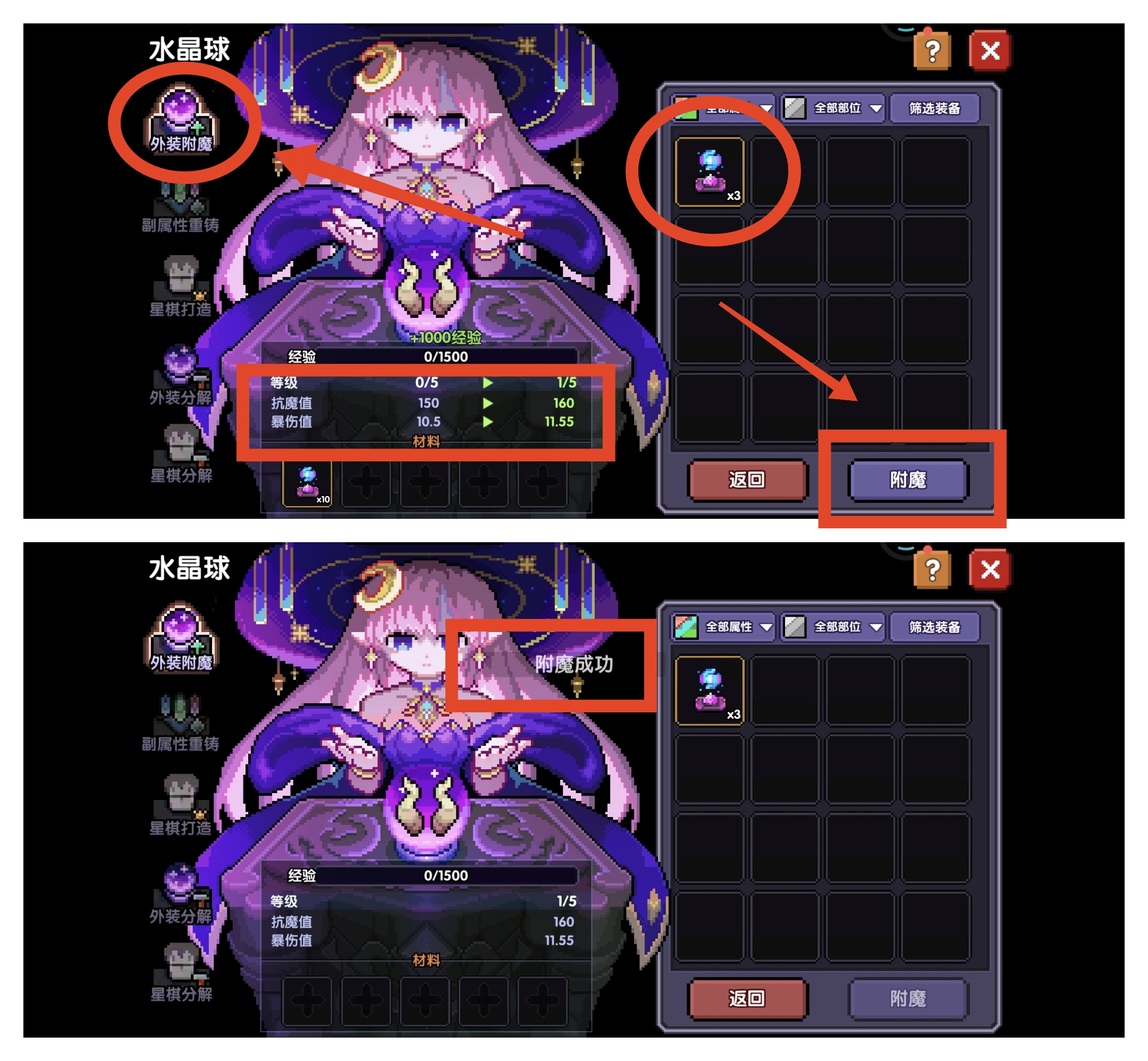 通过分解没用的外装,获取升级材料(图13)。在分解的时候注意看好是不是没用的再分解。把分解后的材料进行外装升级(附魔)。(图14)