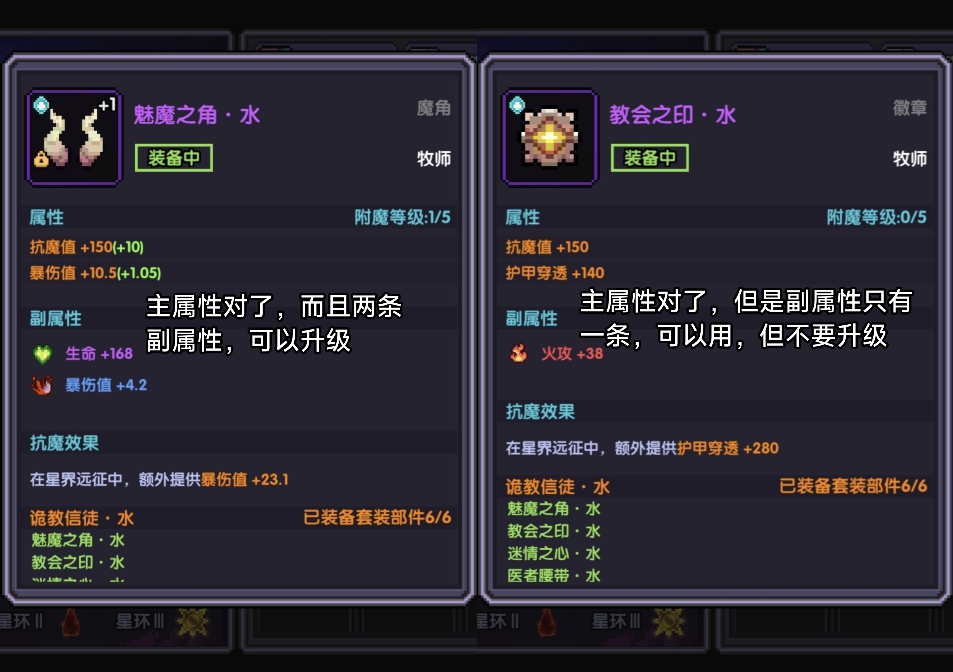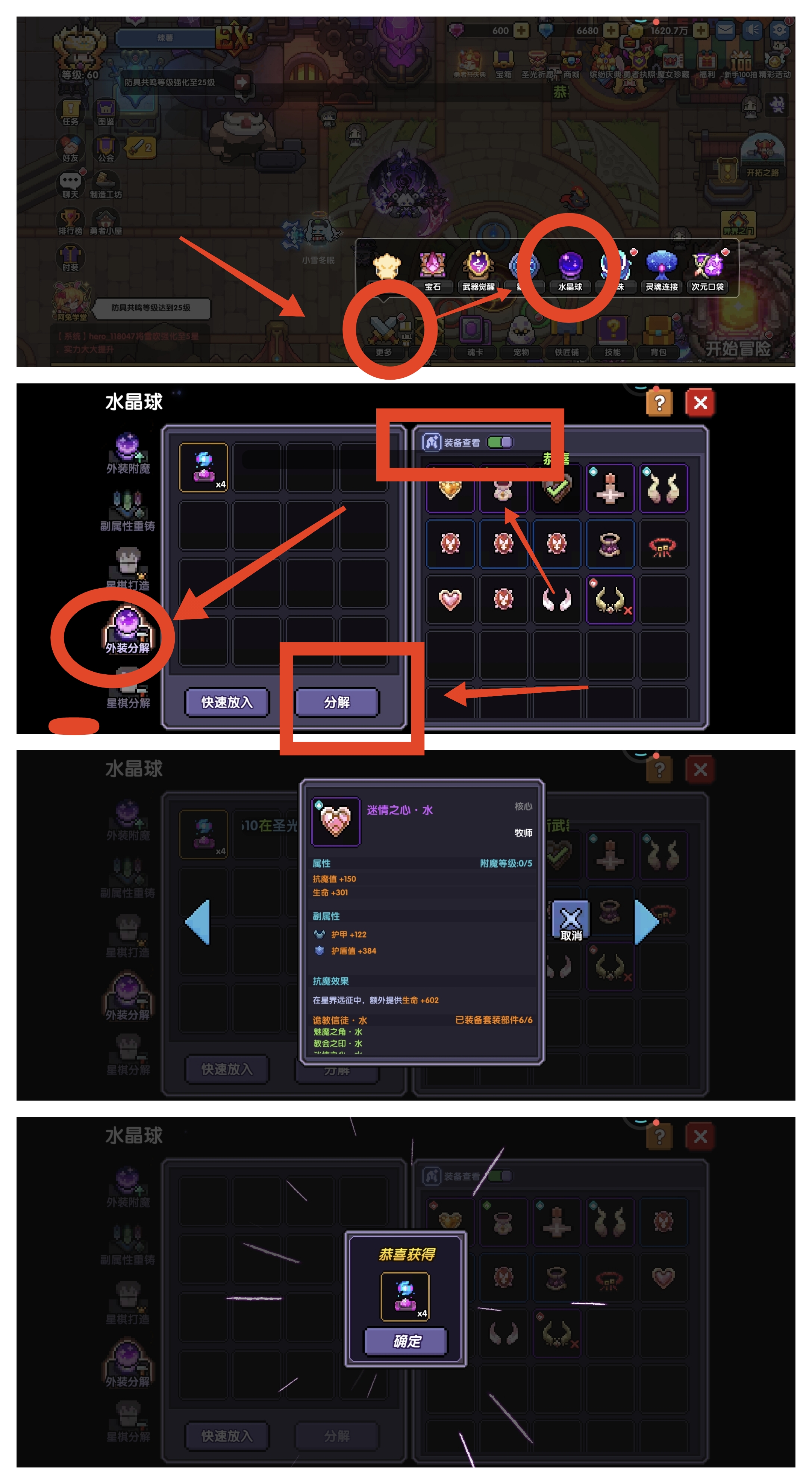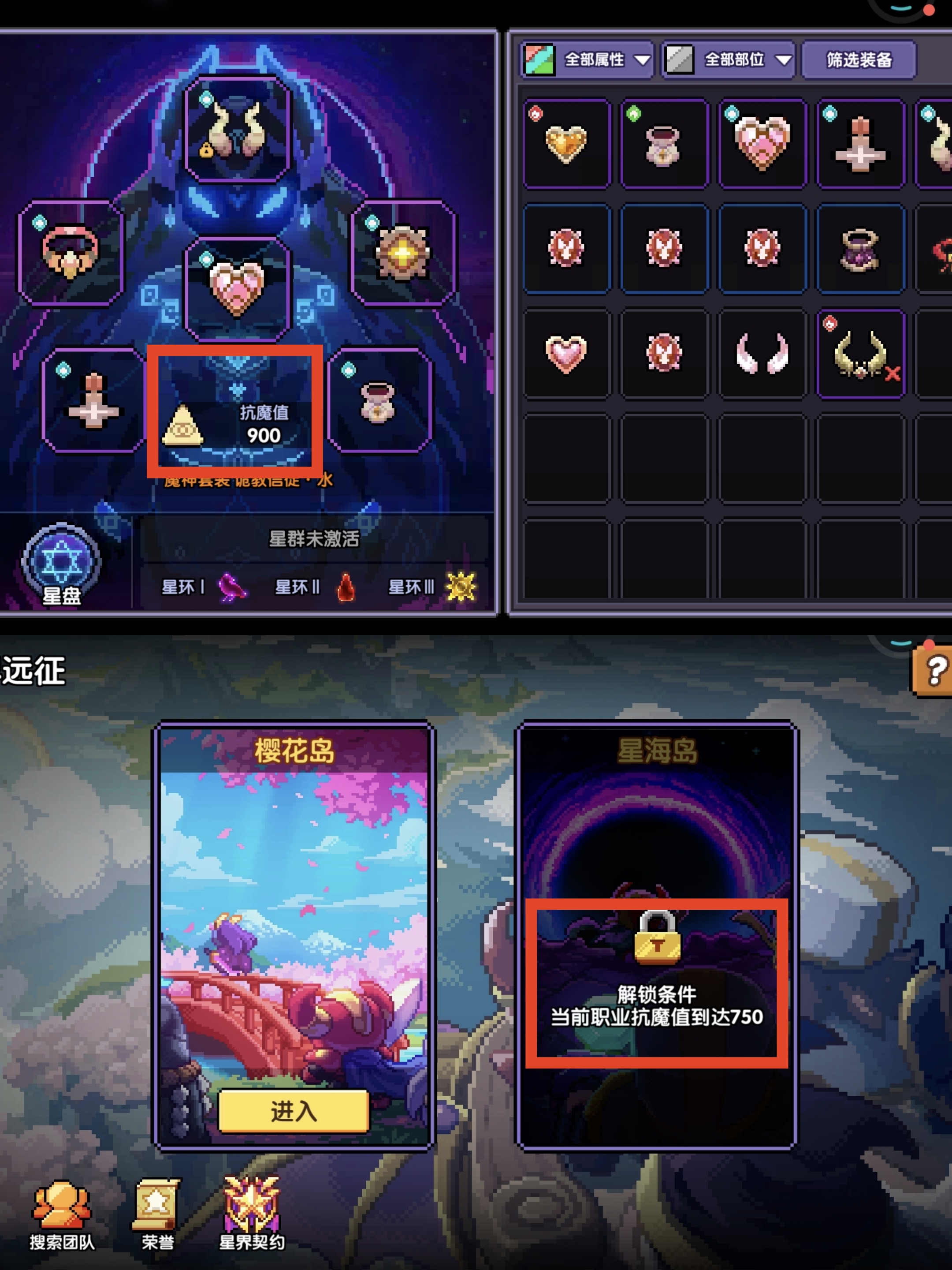 ※开荒前期,当外装模块开启后,优先从②③里拿到6个自选外装宝箱,然后每个位置各开一件水系外装,这样我们前期就能凑齐一套二级外装。(直接+2级技能)(图4),为后面水系BD打好基础。900抗魔值还能直接解锁星海岛团本。(图5)