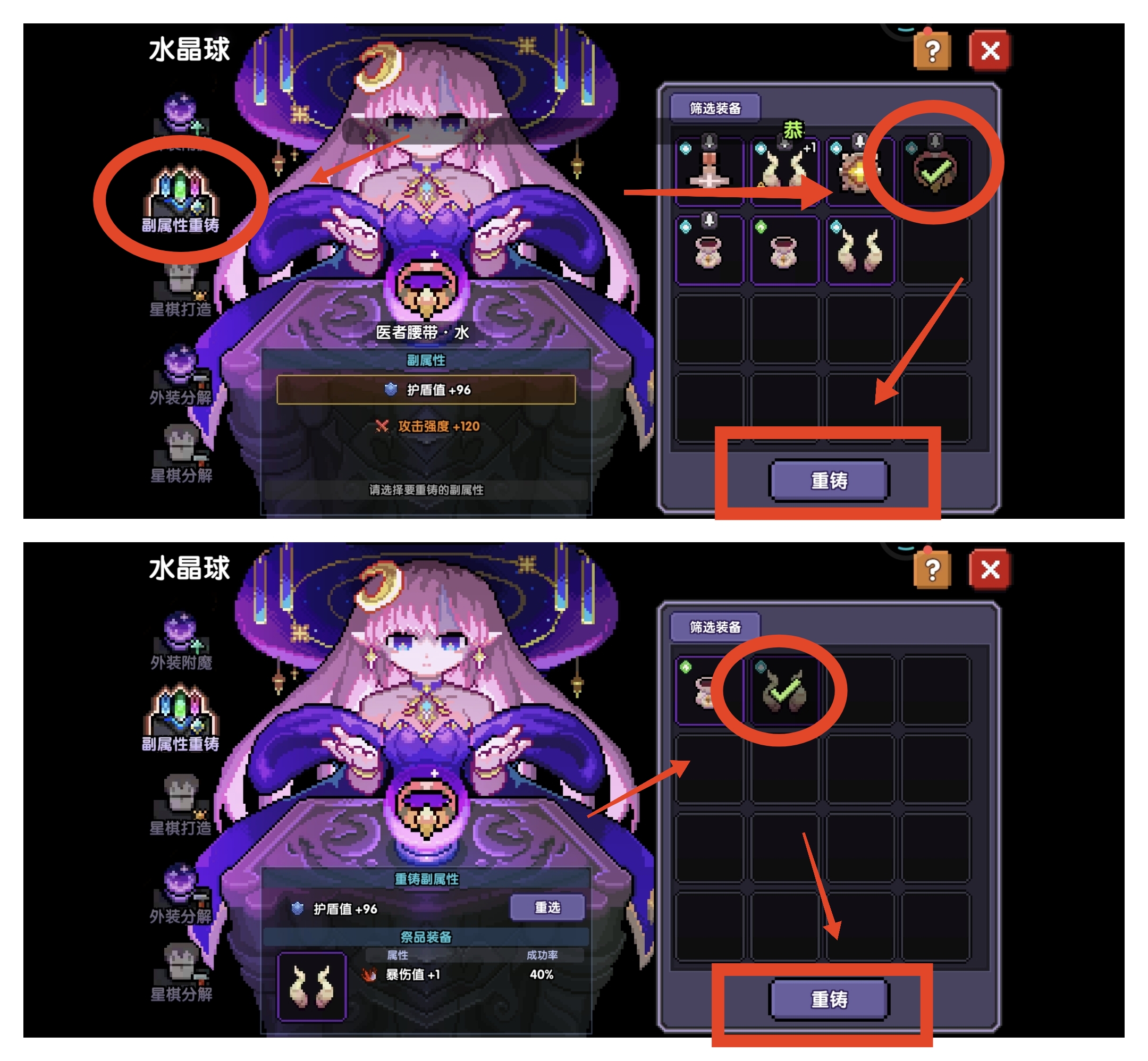 选择我们需要重铸的1号外装,勾选需要重铸的副属性,然后再选择另一件2号外装(这件外装:它的副属性打在我们需要的1号外装上),这样就有机率把2号外装的副属性重铸到我们需要的1号外装上,同时2号外装会消失。(图15)