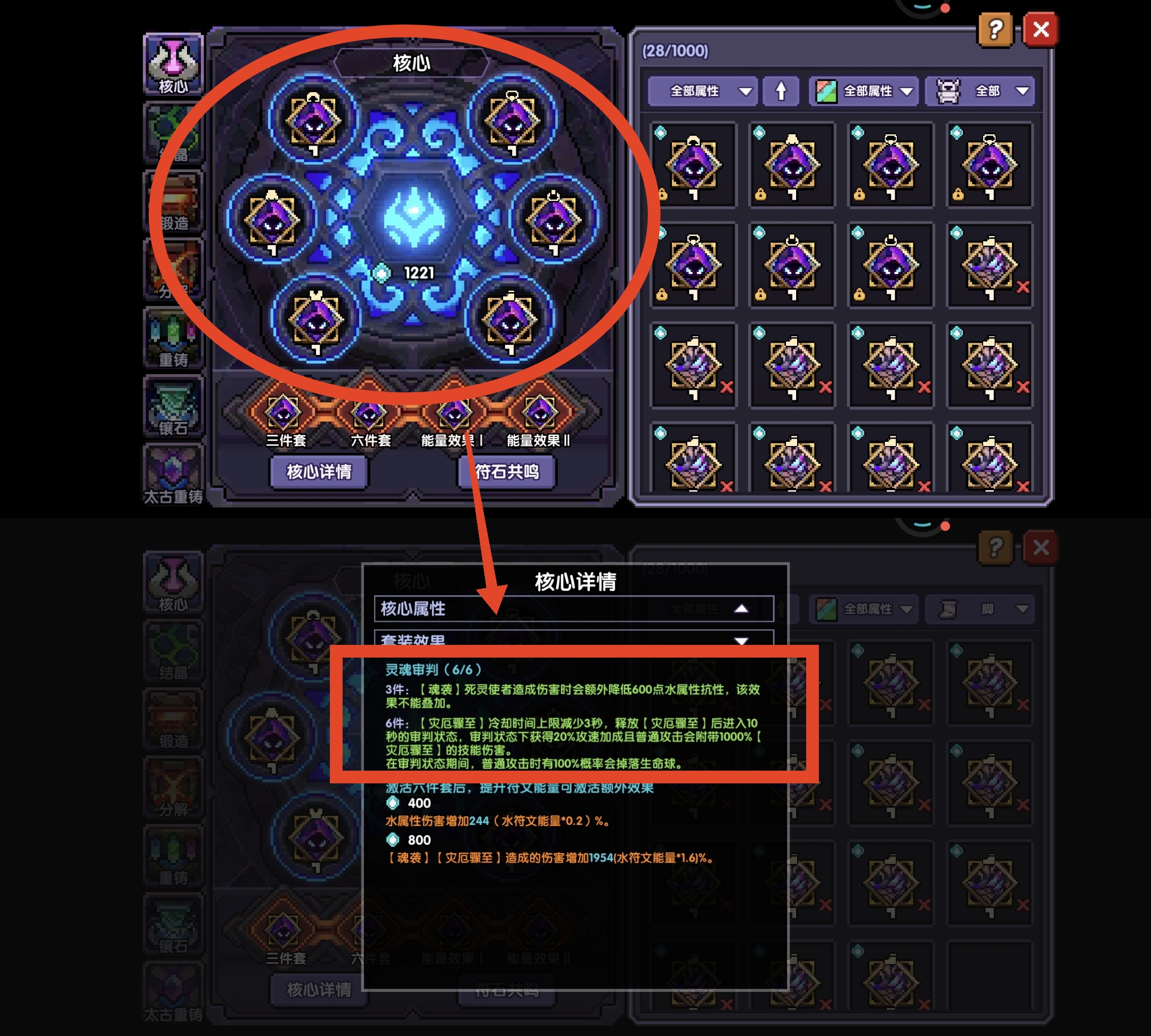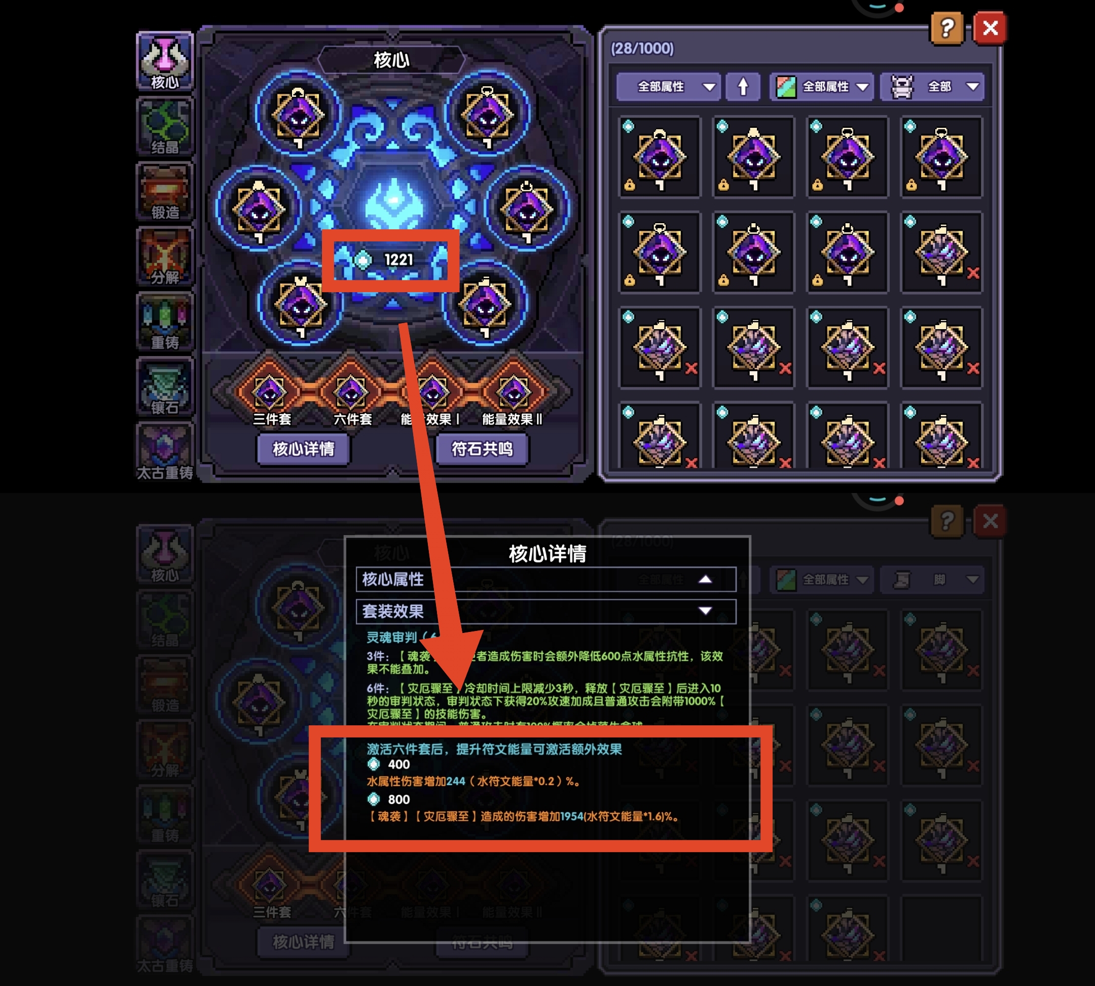 7、小秘境100层后才会开通抗争BD的大符文锻造,所以我们前面就是尽力地去通关小秘境100层,然后去做我们的新水BD,新水BD的符文能量效果是400和800(图8),到时候直接锻造7级的大符文水符文能量就好了。
