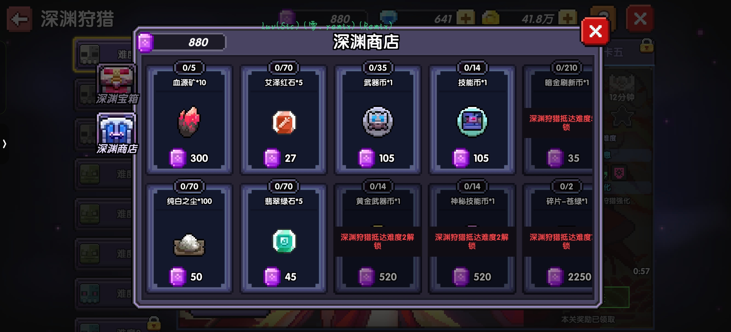 20-50层小秘境我们也会解锁深渊试炼,刚开始玩的第一个礼拜我们就老老实实的打精英怪一点一点堆上去比较好里面的深渊碎片屯着等自己解锁黄金武器币之后再开始兑换,保证每个礼拜都能换满14个黄金币再考虑其他的资源