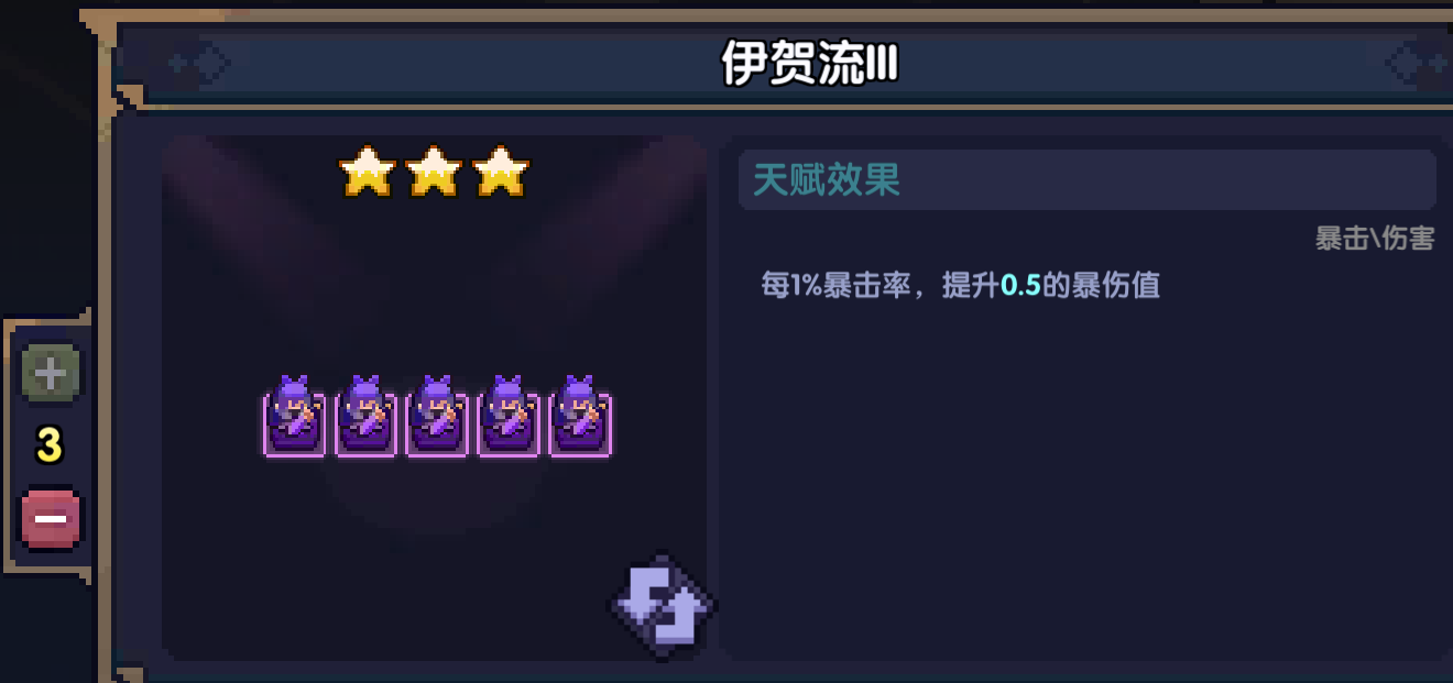 朴实无华的1%暴击率转换为0.5爆伤,因为有该天赋的存在,导致忍者可以在合理的情况下毫无顾虑的堆叠暴击率,个人总结就是新手忍者堆护穿,老登忍者堆属攻,顶配萌新堆暴击,随着账号练度的提升,在攻强属攻都扣到没地方再提的时候,忍者依旧可以靠着甲贺流和伊贺流的联动,将护穿词条转换为暴击词条来进一步提升面板,可以说是忍者这个职业存在的根基之一,核心天赋当之无愧。