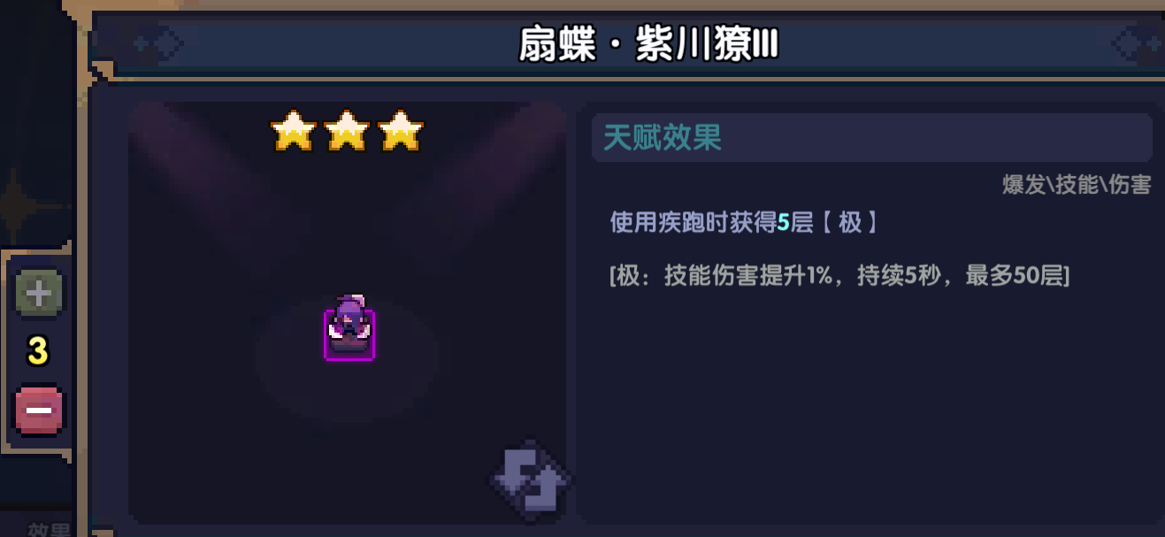 开启疾跑后提供爆伤增幅,但同时会带来高额的减速,在世界boss,公会裂隙等多人场景表现极佳,但单人携带往往提升并没有想象中那么美好,再加以5个格子的位置,因此属于看环境及情况携带的天赋,故特殊天赋。