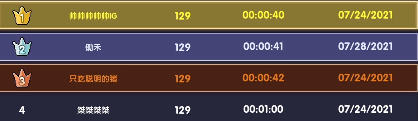 五.合理的死亡,也是冲榜的关键:在生存关中,想要获得比较好的排名,就需要“合理的死亡”。以129为例,生存1分钟满星,生存40s一星。比较有趣的是,本关的结算机制是,在通关的条件下,存活时间越短,获得的排名越高。在没有高练度木系的情况下,想要获得更高的排名,有时就需要“合理的死亡”,上张图: