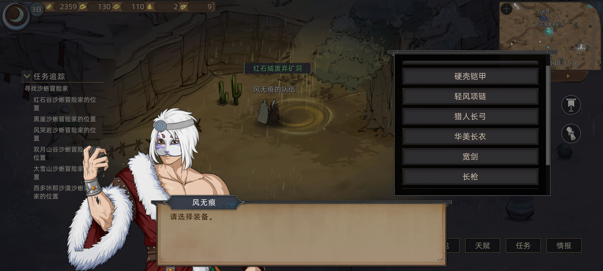 风无痕感觉自己腿累了~之前在红石城商店都没发现代步工具。索性运气很好,潜入陶山镇时发现一匹宝马,果断买下