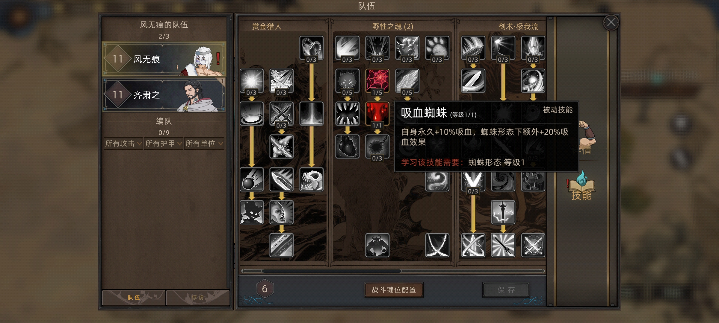这边因为楼主是五周目难度,所以初始等级11级,游戏等级上限45级。技能点加上开局的一点结晶总共12点可以分配,这里花两点给野兽技能页,点出10%被动吸血。让我们的主角风无痕具备战斗续航能力