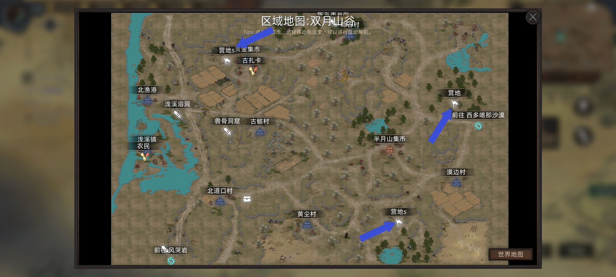 好了,都弄好了。开始准备进入大地图,这里玩家可以自由选择自己喜欢的起点,然后该地区解锁通商许可,这里建议大家选择红石谷,因为这里有前期最基本的装备副本可以刷。