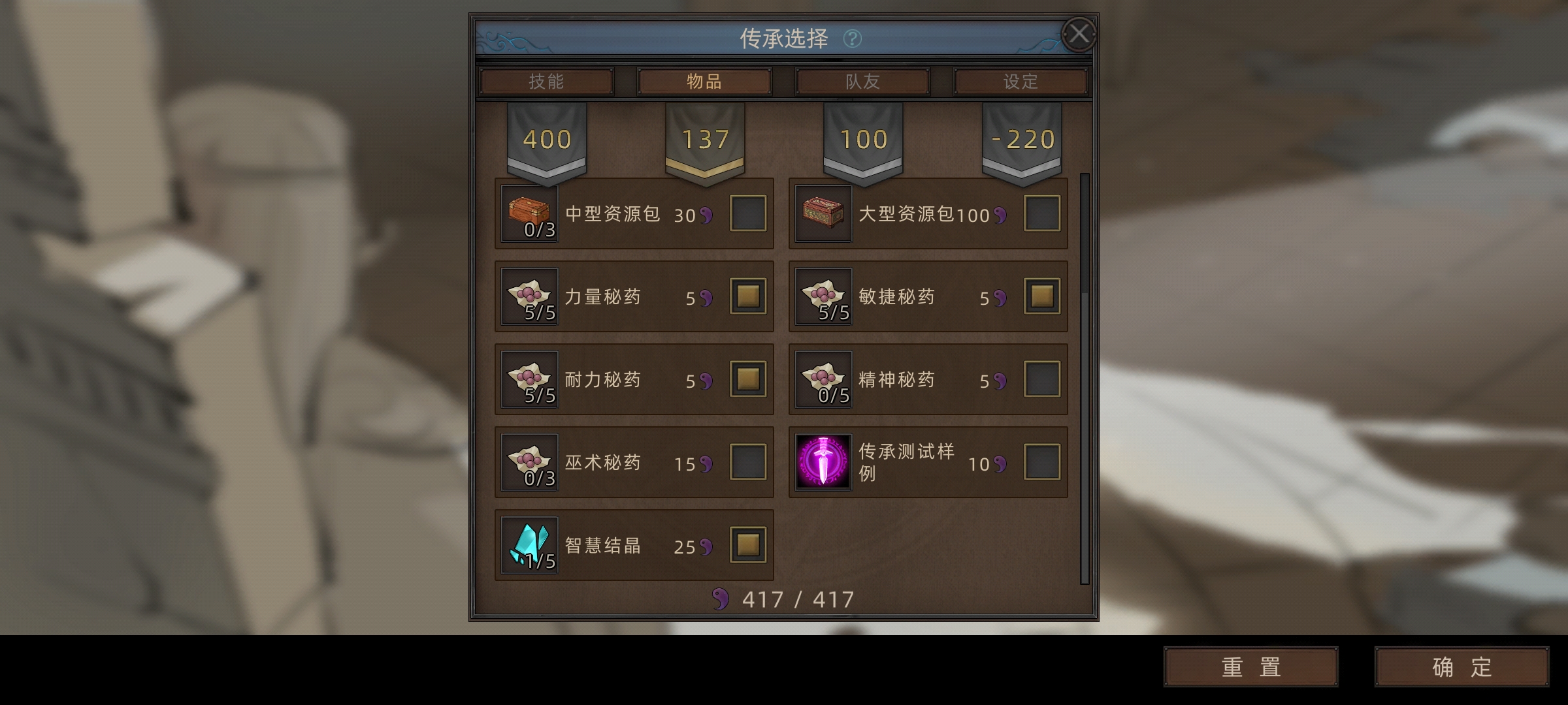 然后剩下的成就用来物品栏选择,力敏耐拉满,然后智慧结晶是加技能点的,这里楼主就选了一个,因为成就不够用了,新人可以优先拉满。这东西到中期就不缺了,结档的时候都还剩下五十多个。上面楼主点了个小形资源包。够交第一个地区保护费解除通缉状态就行,因为无名剑主开局是被所有势力通缉的。然后最后剩27点全部选择背包格子,背包在前中期效益非常大。