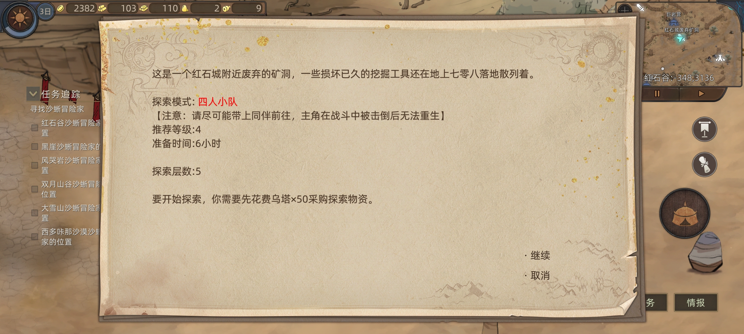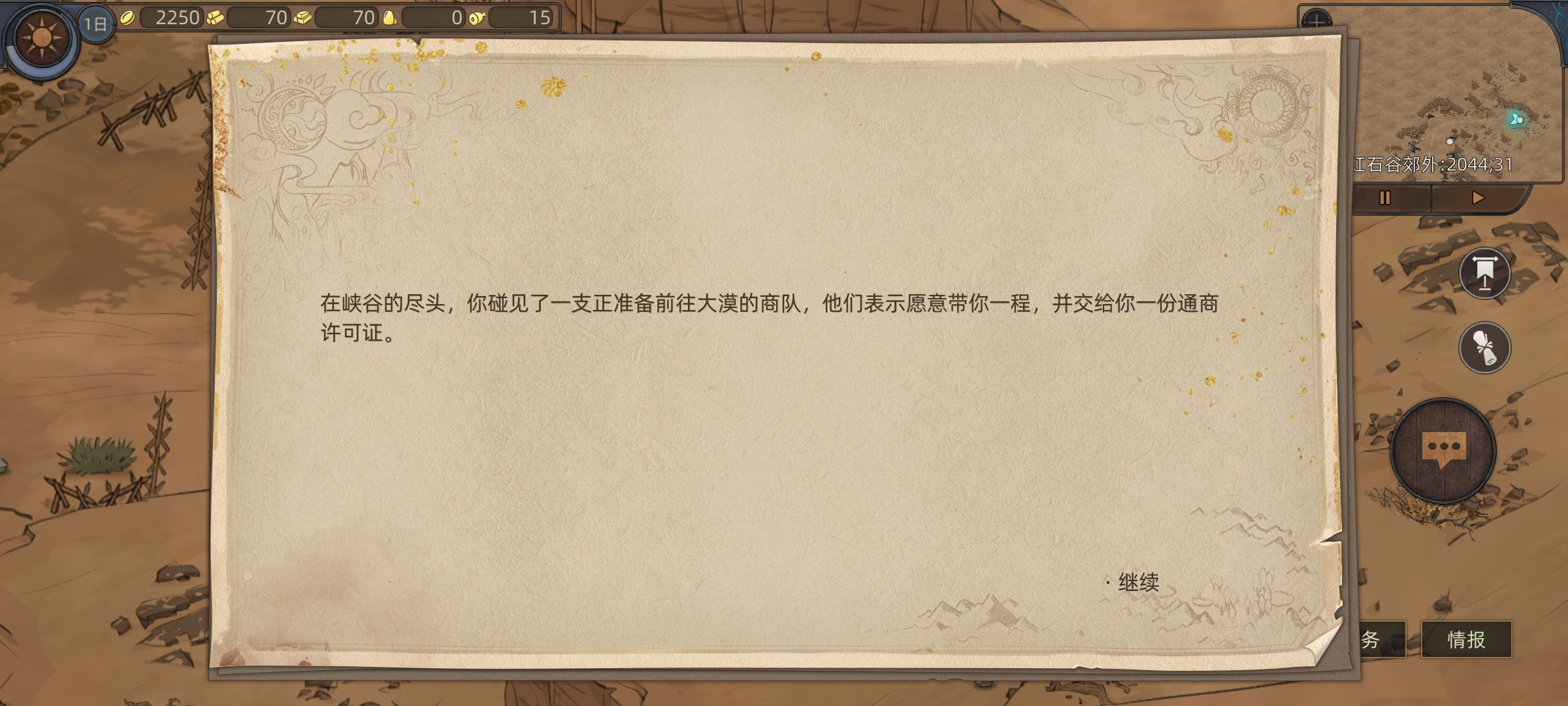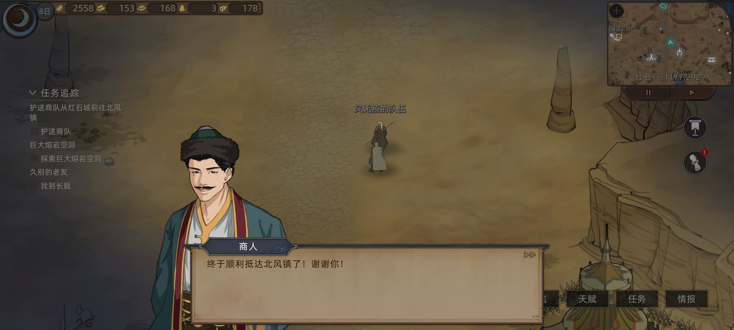 做完驿马村任务后我们接着往上走回到红石城,运气非常好随机到商队任务。这个任务最舒服,直接领取就好,不用护送商队,让它自力更生。大概率它自己能安全到达的,嘻嘻~白得奖励。