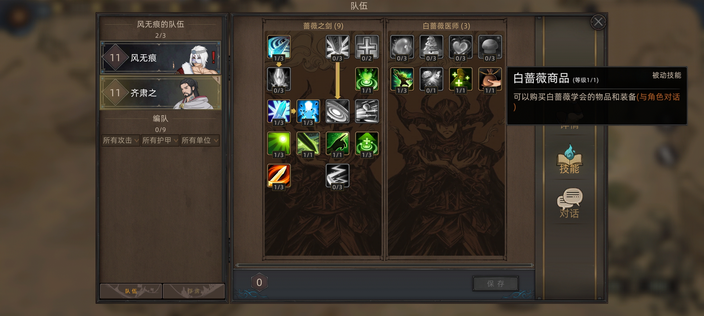 这里选了齐肃之,能打能奶还能降低敌人数值,然后能治疗部队重伤。最重要的是为了14天一次对话领取生命药剂技能,食用加500生命。综合一局下来两三百天可以为主角增加6k-1w点生命值。技能商店里还有三天刷新一次加30生命上限和10气力上限的资料书购买,你值得拥有。