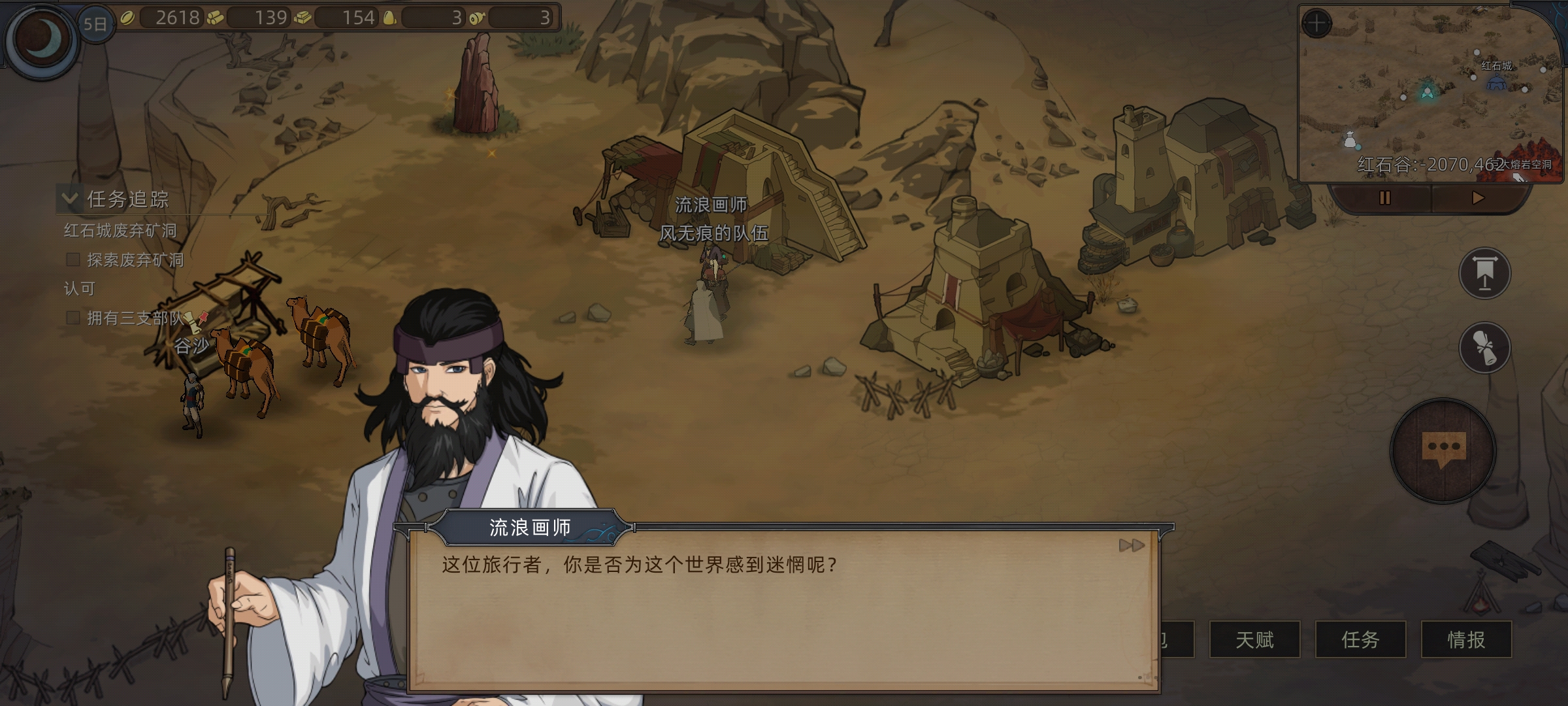 打完矿洞副本拿了装备我是可以直接去新地图的,因为我初始等级比较高。但为了照顾新手,这里往下走,把红石城支线任务都领了。然后去欣赏一下画师的优美画技讲述一个王朝故事,旁边的天赋碎片和谷沙的支线任务也顺手领了。