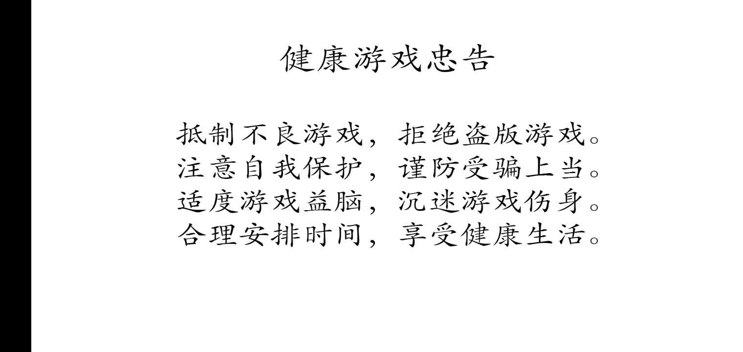 拒绝不良游戏 拒绝盗版游戏 注意自我保护 谨防受骗上当 适度游戏益脑 沉迷游戏伤身 合理安排时间 享受健康生活。
